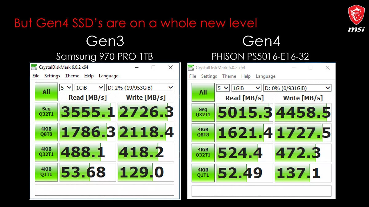 В случае же SSD-накопителей новый стандарт раскрывает себя гораздо лучше. К примеру, скорость чтения вырастает с 3500 МБ/с до 5000 МБ/с.
