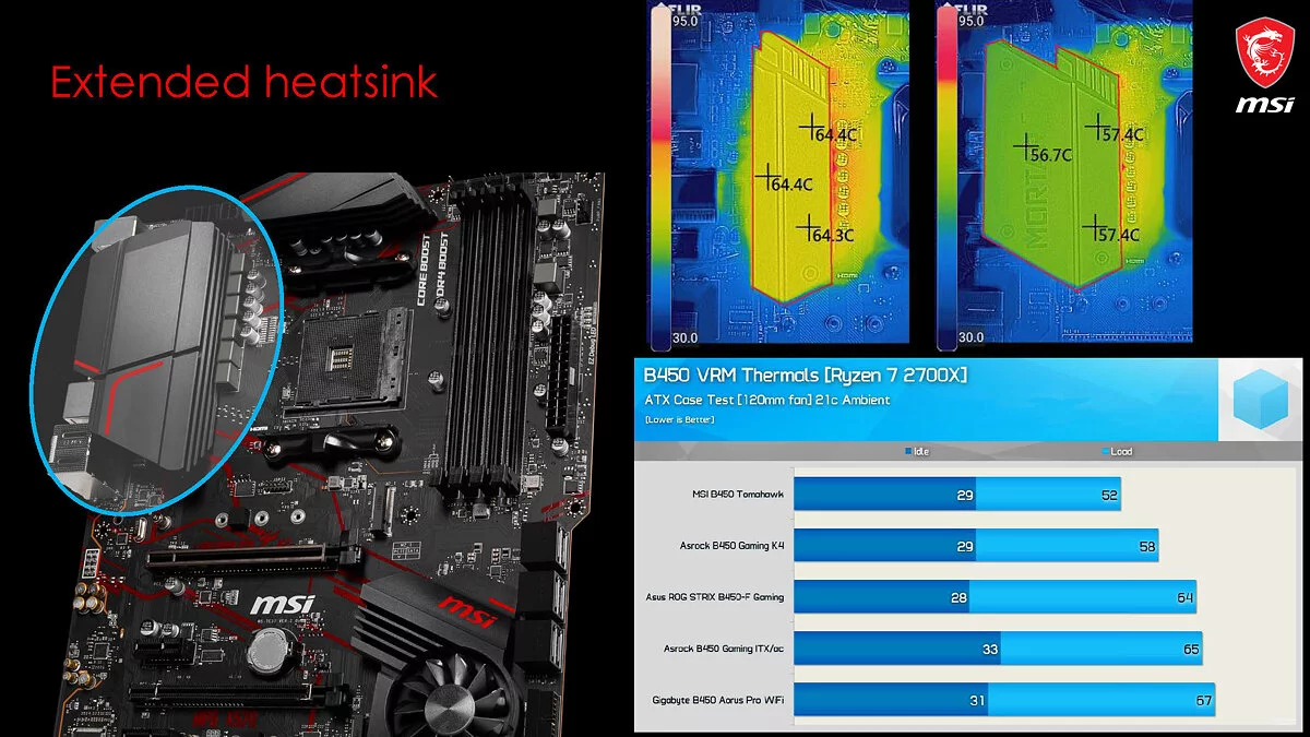 Среди плюсов новой линейки материнок MSI также выделяет увеличенный радиатор, расположенный у планки портов ввода-вывода. Для предотвращения перегрева платы радиатор VRM и радиатор чипсета соединены удлиненной тепловой трубкой.