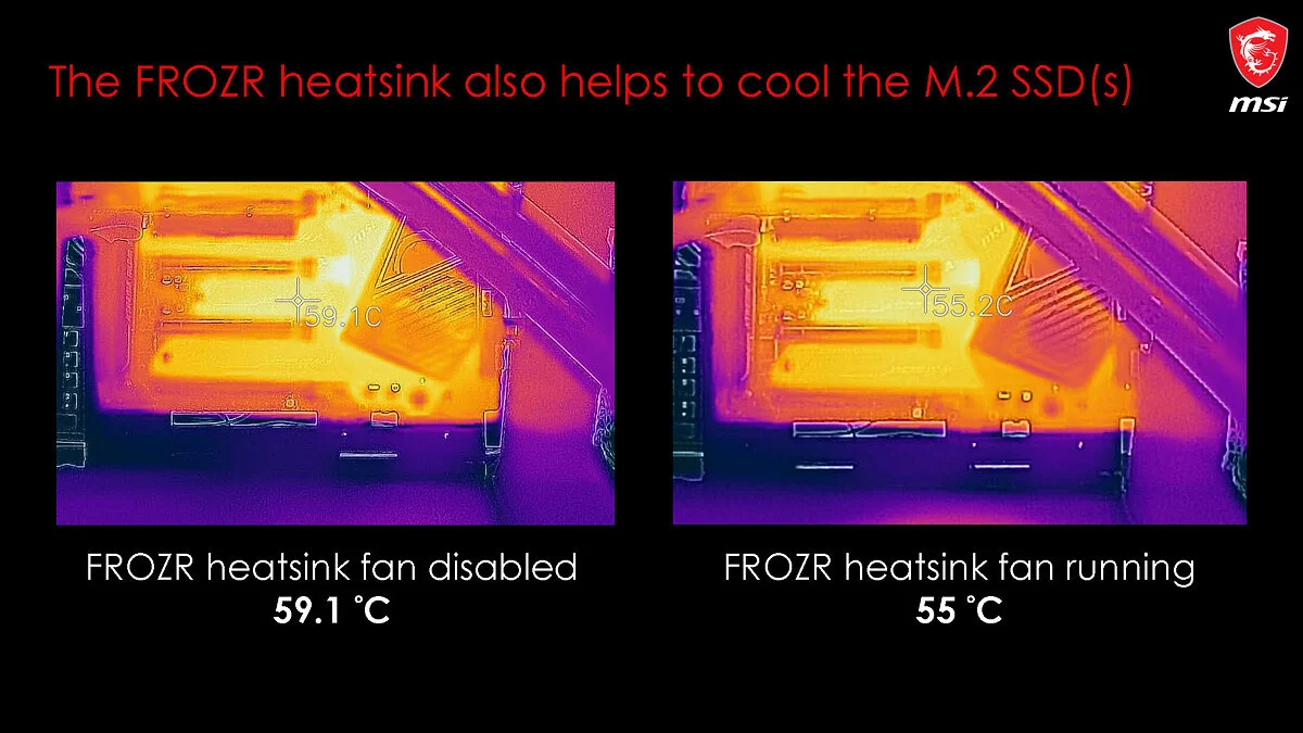 За охлаждение X570 отвечает специальный радиатор FROZR с крыльчаткой 45 мм (вращается в двух шариковых подшипниках). Можно самому регулировать режимы работы вентилятора, но если температура не превышает 70 градусов, охлаждение будет пассивным.