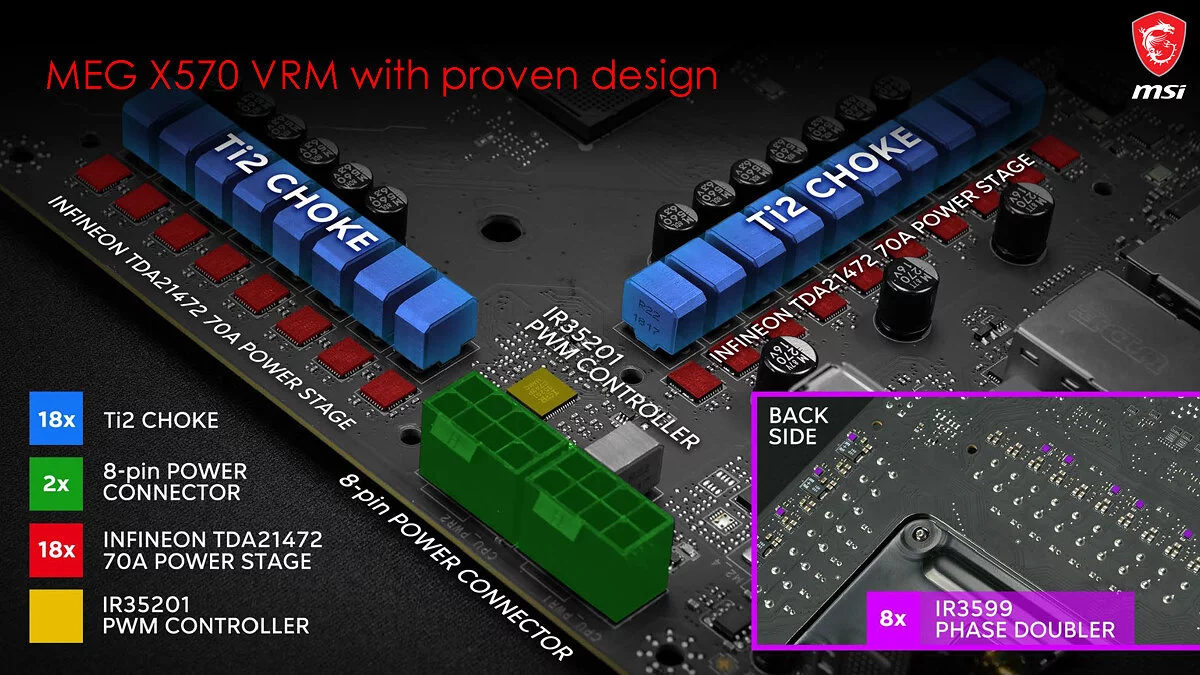 Материнские платы серии MEG имеют 18-канальную систему питания и два 8-контактных выделенных разъема питания.