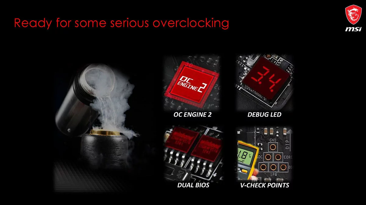 Материнские платы также подходят для оверклокинга. Для этого предусмотрены технология OC Engine 2, индикатор Debug LED, двойной BIOS и контакты V-Check Points для измерения напряжения на процессоре.