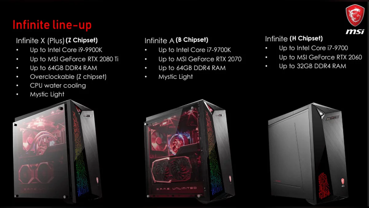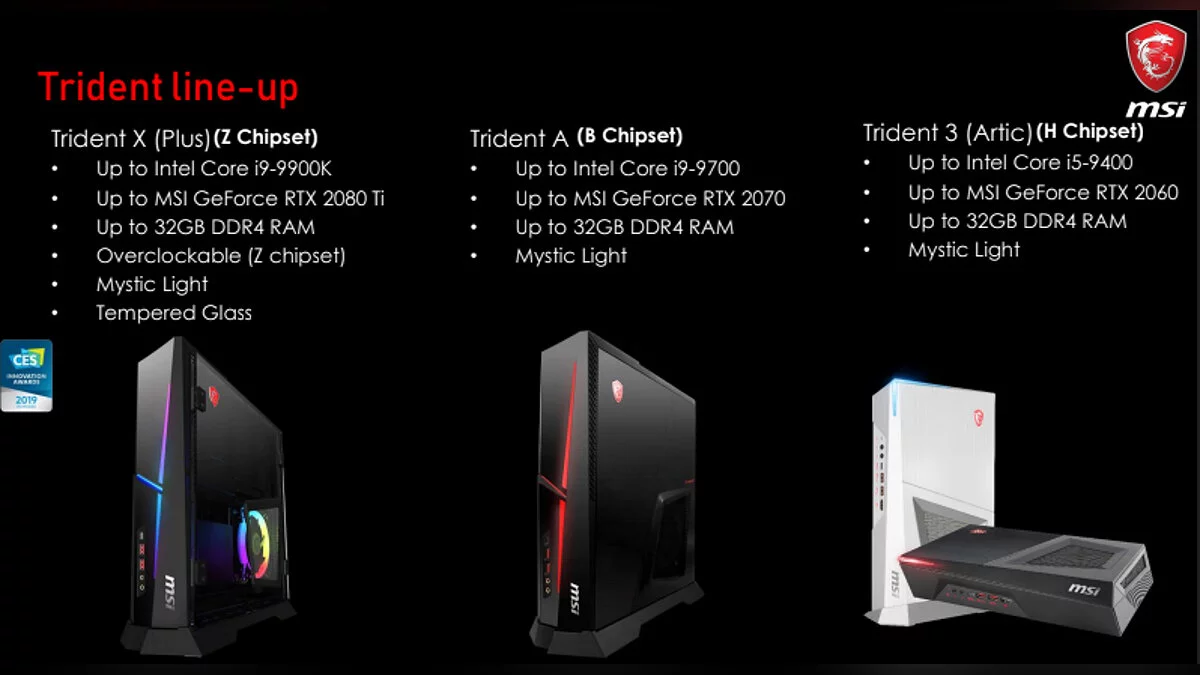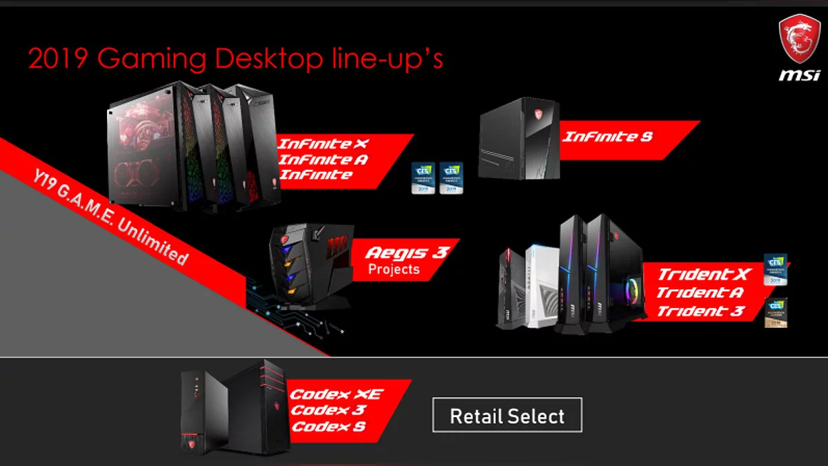 В 2019 году MSI подготовила для геймеров целый набор десктопов, включая модели InFinite X, InFinite A, InFinite, InFinite S, Aegis 3, Trident A (с обзором можно ознакомиться здесь), Trident X, Trident 3, Codex XE, Codex 3 и Codex S.
