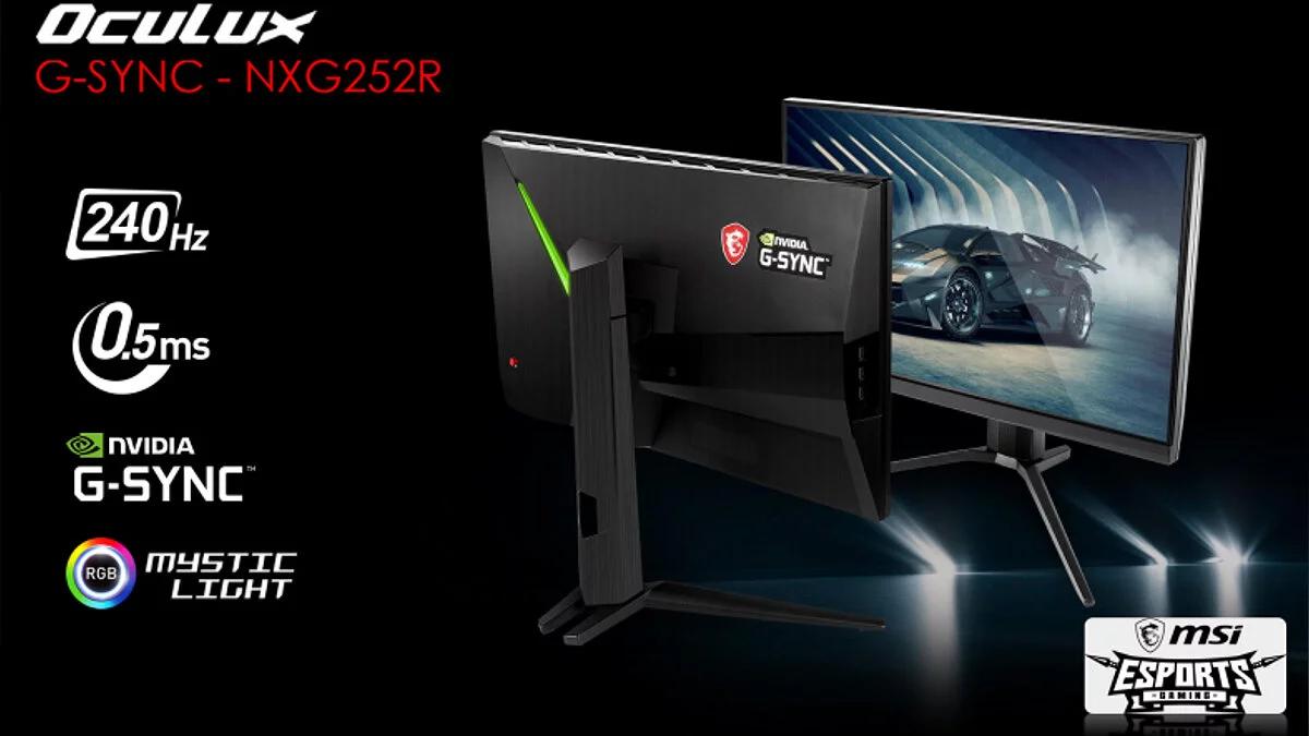 - Oculux NXG252R (240 Гц, 0,5 мс, Nvidia G-SYNC, Mystic Light, 24,5 дюйма, 1080p);