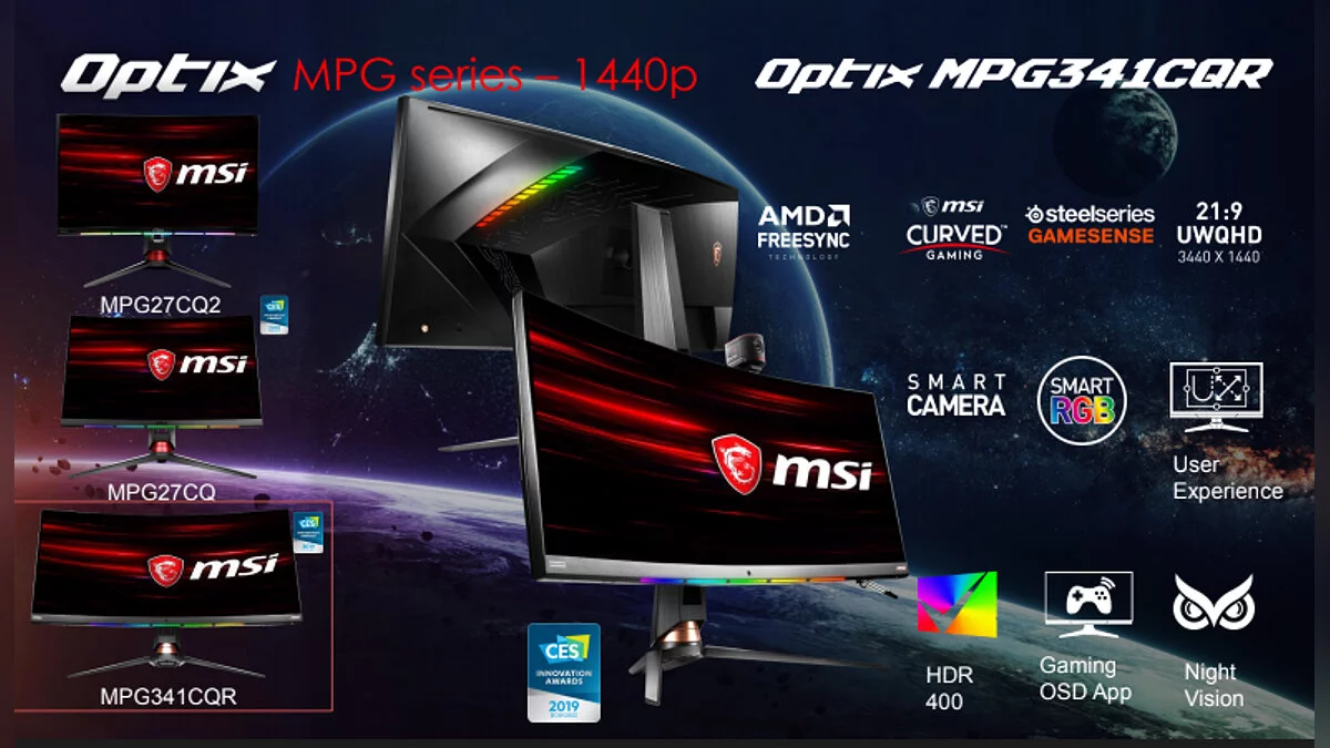 - MPG341CQR (AMD FreeSync, Curved Gaming, 1440p, Smart RGB, HDR 400, утилита Gaming OSD App, Night Vision, Smart Camera, технология SteelSeries GameSense);