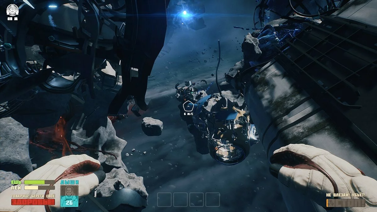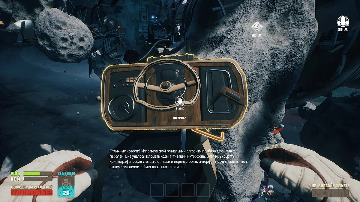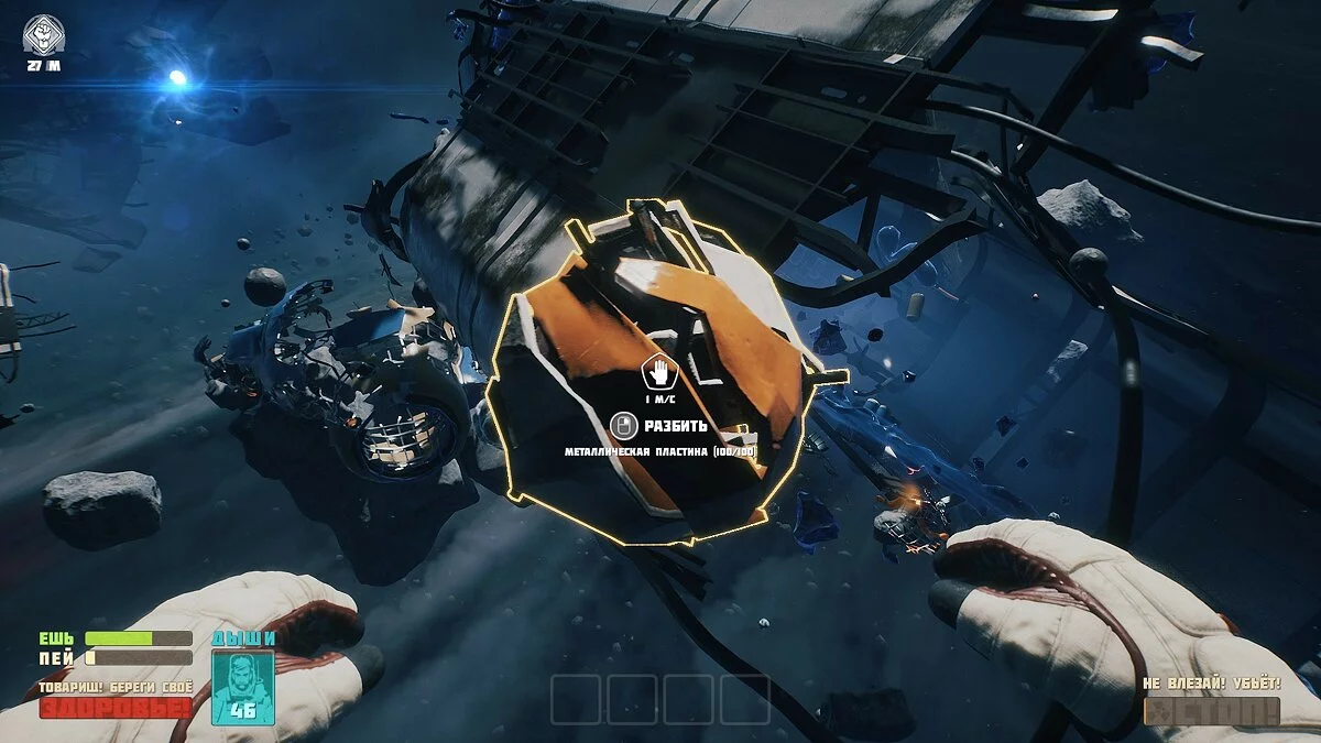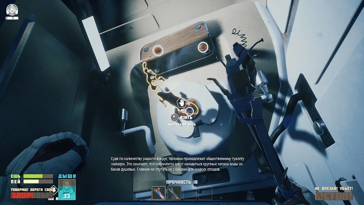 На первых порах скафандр главного героя плохо приспособлен к космическим приключениям: воздуха хватает меньше, чем на минуту. Что можно успеть за это время? Много всего! Например, долететь до ближайшего туалета, чтобы помочиться. Да, в игре можно опорожнить мочевой пузырь, но лучше потратить драгоценное время на сбор ресурсов для крафта.