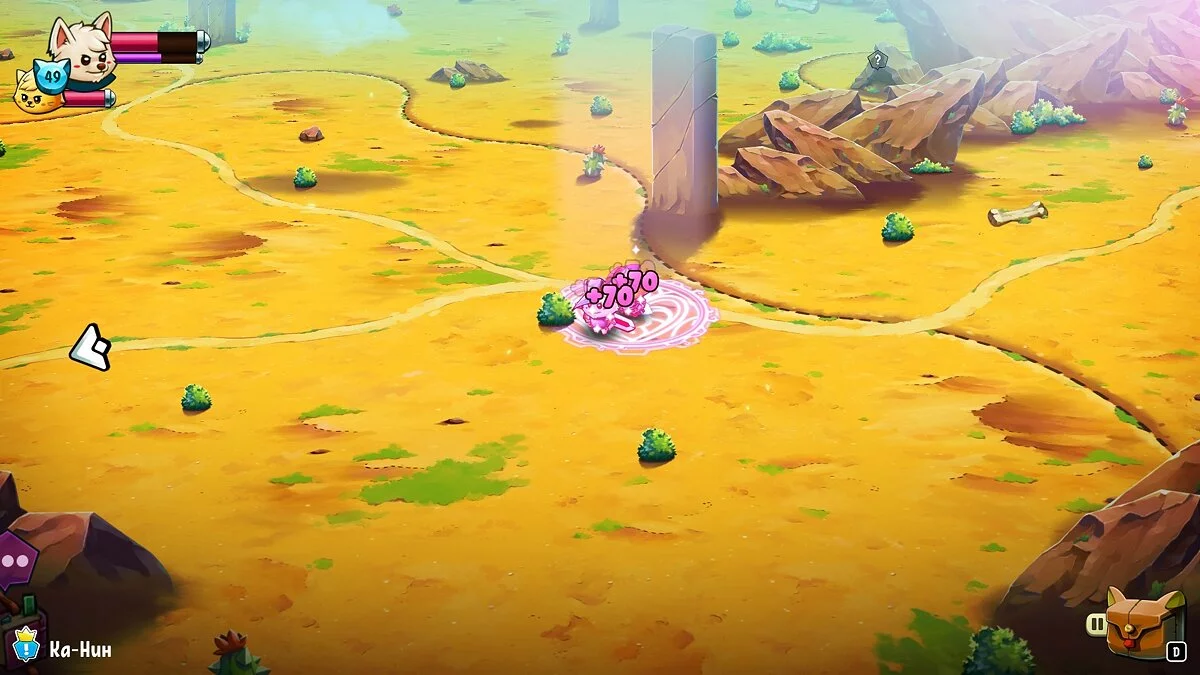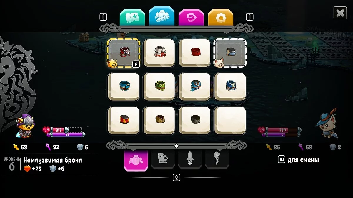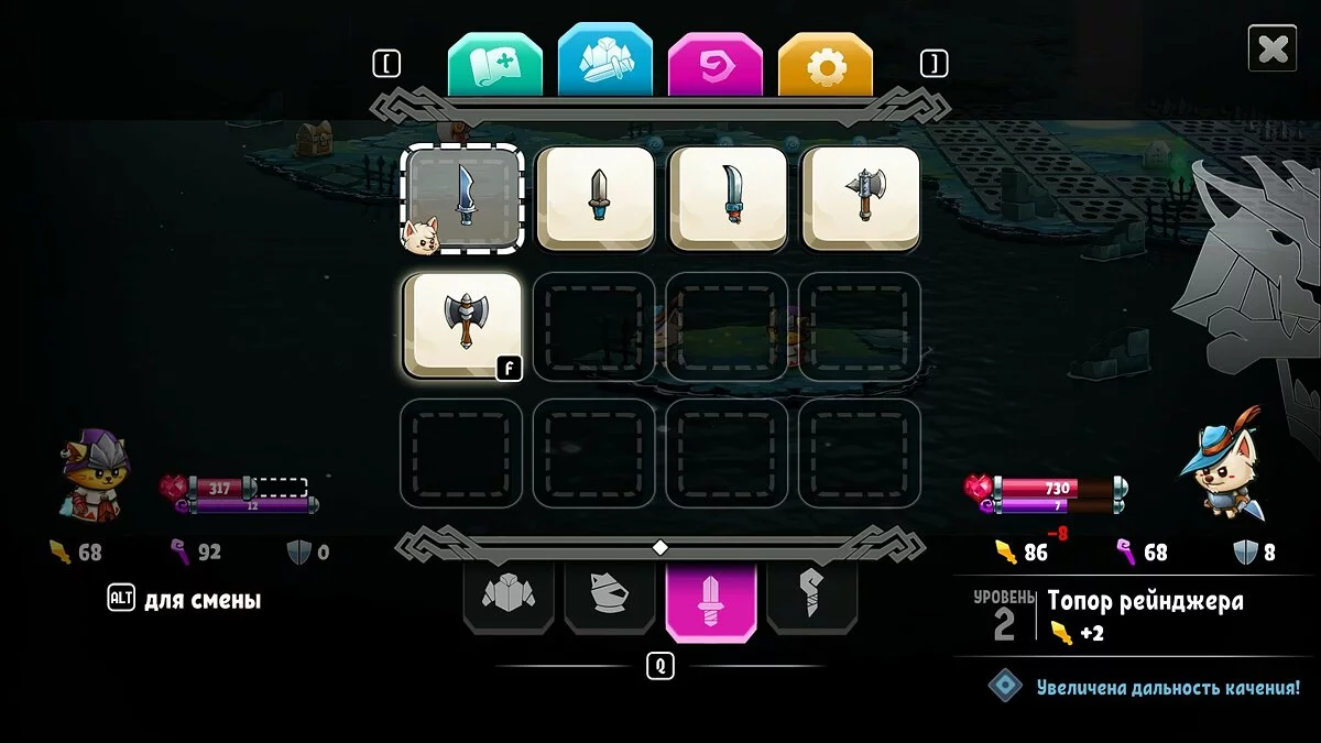 Под стать лучшим RPG, в распоряжении игрока находятся сразу два персонажа — Кошка и Собака. Их можно настроить под разные стили и переключаться по ходу боя. Я, например, большую часть прошел за собаку, собирая вокруг неё всех врагов и давя их огромным «Эскалифыром», а кошак вертелся рядом с разными магическими заклинаниями и восстанавливал здоровье.