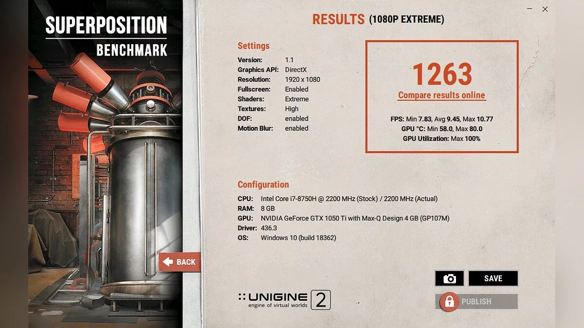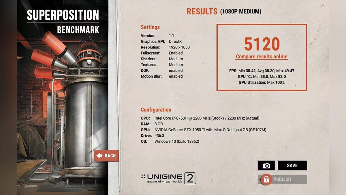 В бенчмарке Unigine Superposition с выбранным профилем 1080p medium MSI GF63 8RC уверенно держал показатель FPS в районе 30-50 кадров. А вот 1080p extreme ему уже оказался не по зубам.