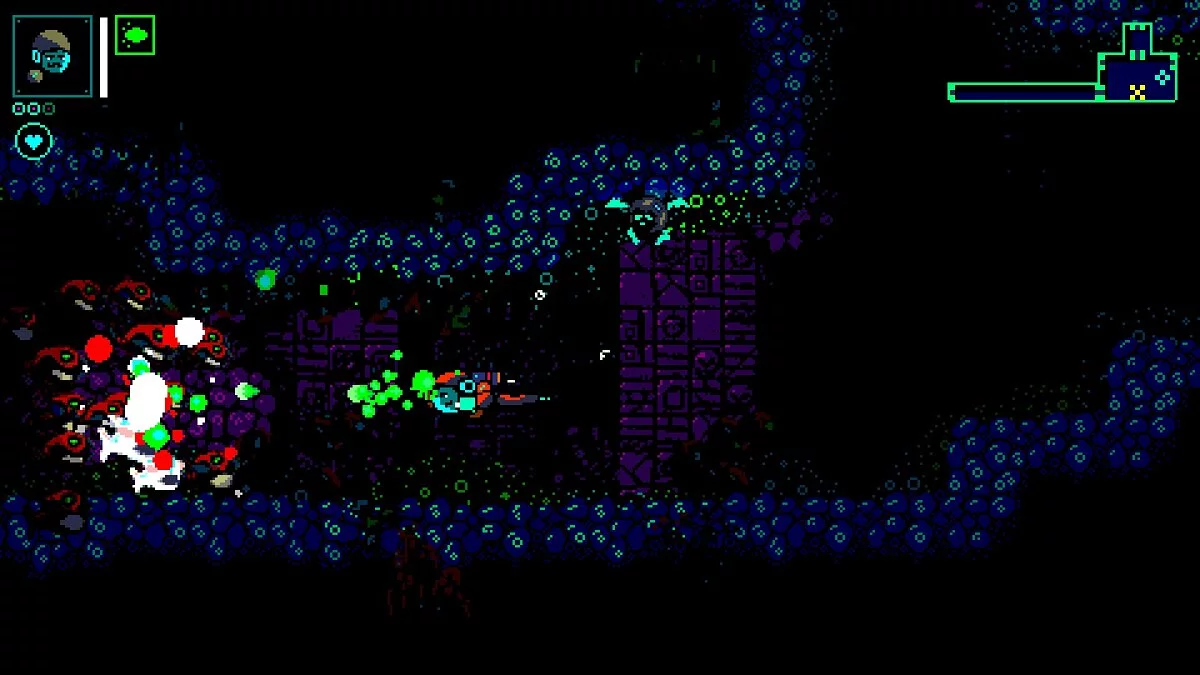В остальном, повторимся, классическая «метроидвания»: львиную долю времени мы аккуратно (здоровье превыше всего!) расстреливаем врагов, выполняем акробатические этюды, много плаваем и ищем апгрейды для прохождения. В игре есть открытый мир, но с ходу попасть во все точки не получится — многие двери поначалу заперты. Двери, к слову, бывают разных цветов. Чтобы их открыть, необходимо выстрелить из соответствующего оружия: в обычную достаточно бахнуть из рядового бластера, а вот розовая поддастся только мощным зарядом, который можно разблокировать в-о-о-о-н в той части карты.