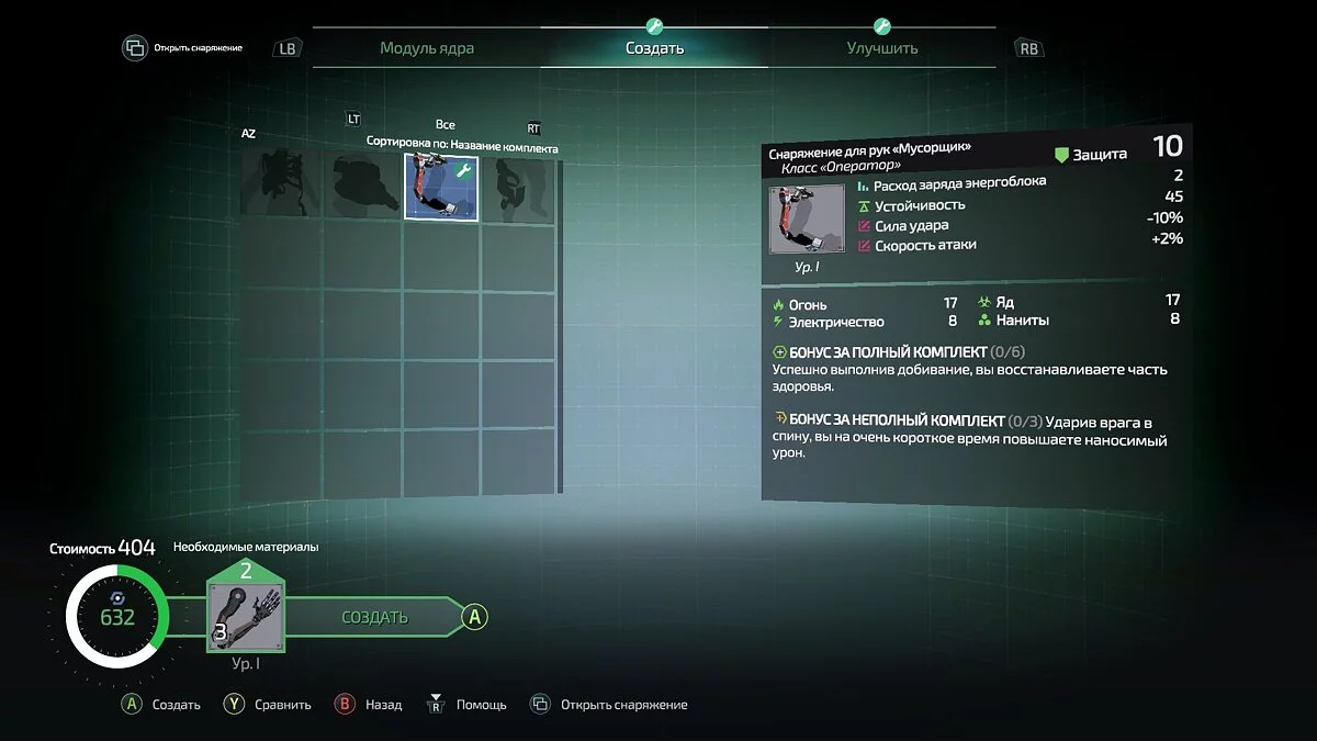 Еще одно важное отличие The Surge 2 от игр серии Dark Souls заключается в наличии бонусов за ношение полного комплекта брони одного типа. Всего у персонажа есть шесть слотов: один для головы, один для торса, два для рук и еще два для ног. Каждый набор брони дает определенные преимущества за ношения полного и неполного комплекта.