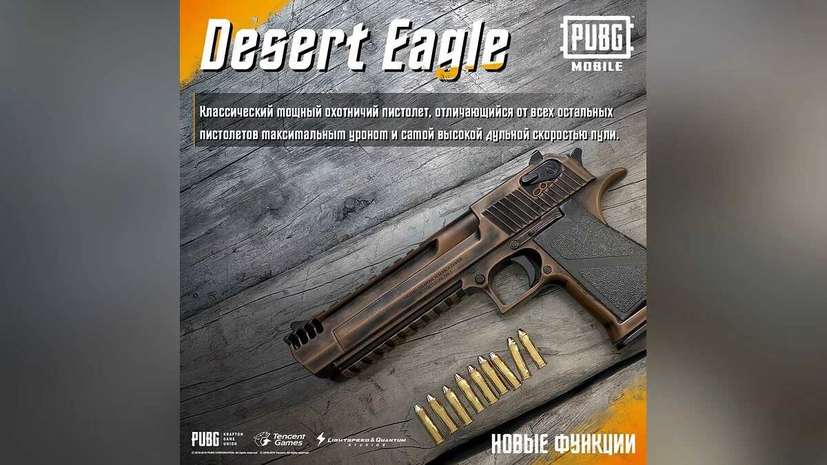 Разумеется, не обошлось и без новинок в модельном ряду. Помимо четырех гранатометов и пулемета, которые были упомянуты выше, в PUBG Mobile завезли новый пистолет — Desert Eagle, знакомый многим геймерам по другим играм.