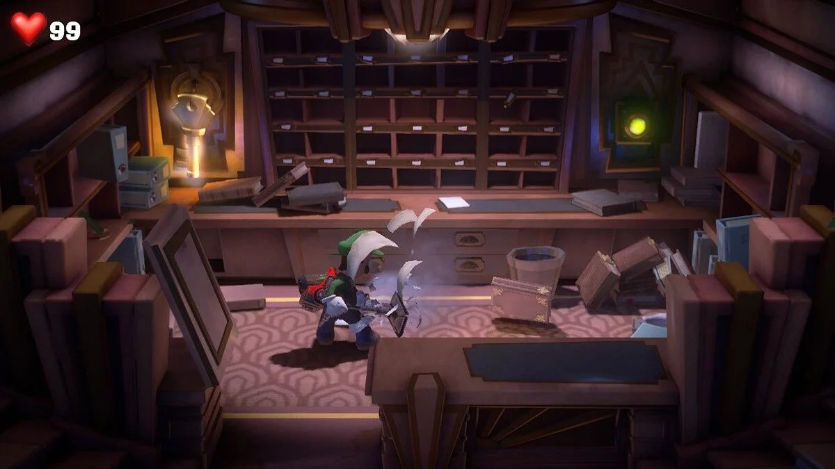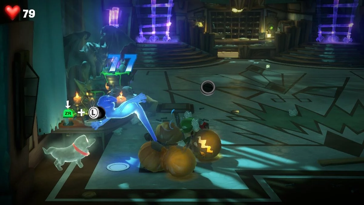 На локациях разбросано много разных предметов — мебель, хэллоуинские тыквы, ящики и так далее. Часто они загораживают проходы, так что их приходится оттаскивать с помощью метательного вантуза. Это новая модификация для пылесоса, вокруг которой построено много физических головоломок. Да-да, в Luigi's Mansion 3 есть физика, и она хороша.