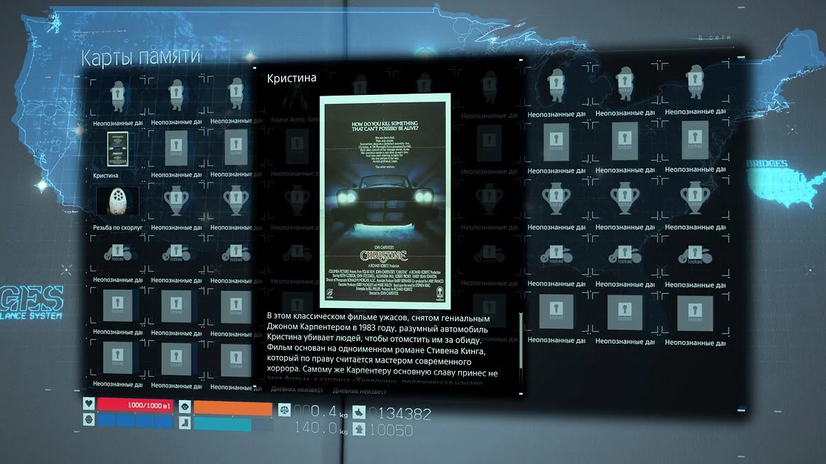 В игре есть отсылка к культовому фильму ужасов «Кристина» 1983 года, созданного по мотивам одноименного романа Стивена Кинга (Stephen King). Чтобы увидеть эту пасхалку, нужно отыскать определенную карту памяти (как ее найти, можно узнать здесь). В игре есть и другие Карты памяти, отсылающие к фильмам, включая «Крупная рыба», «Ночь страха», «Семь самураев», «Мост через реку Квай» и «Доктор Стрейнджлав, или Как я перестал бояться и полюбил бомбу».