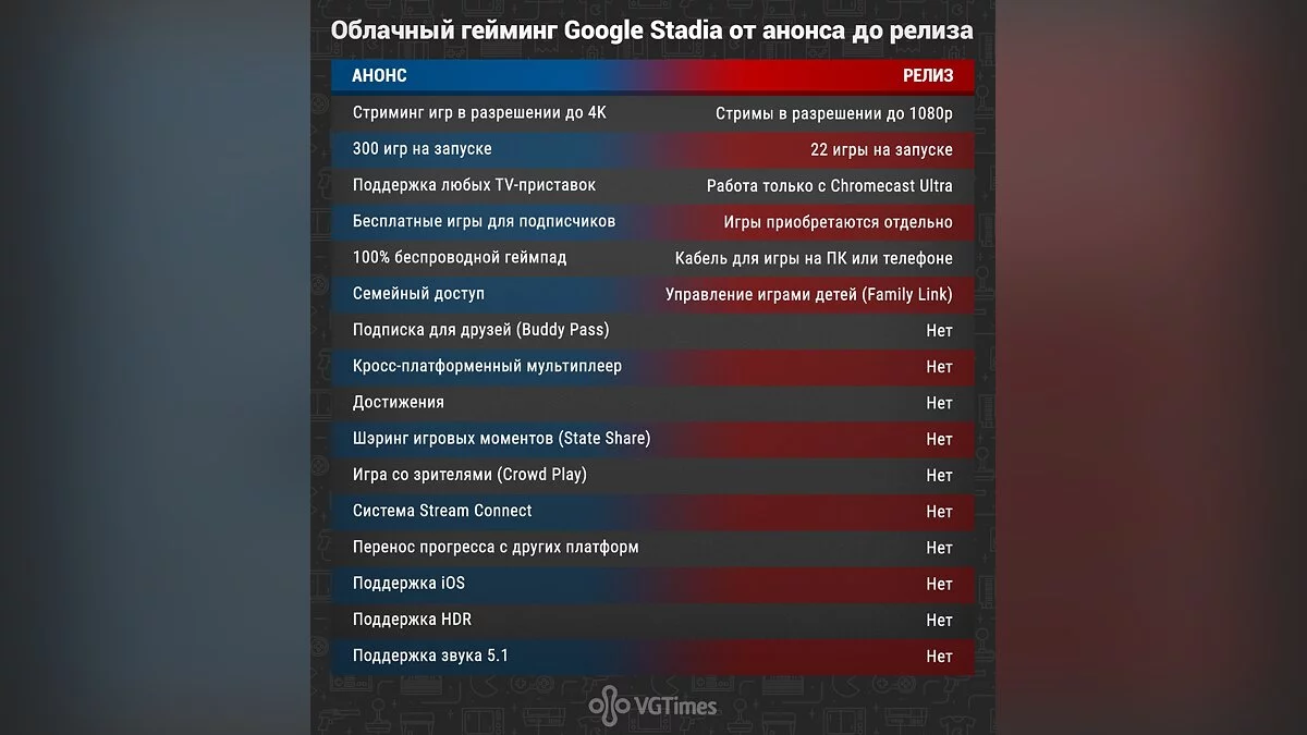 Каких функций не оказалось в Google Stadia ко дню релиза — в одной картинке