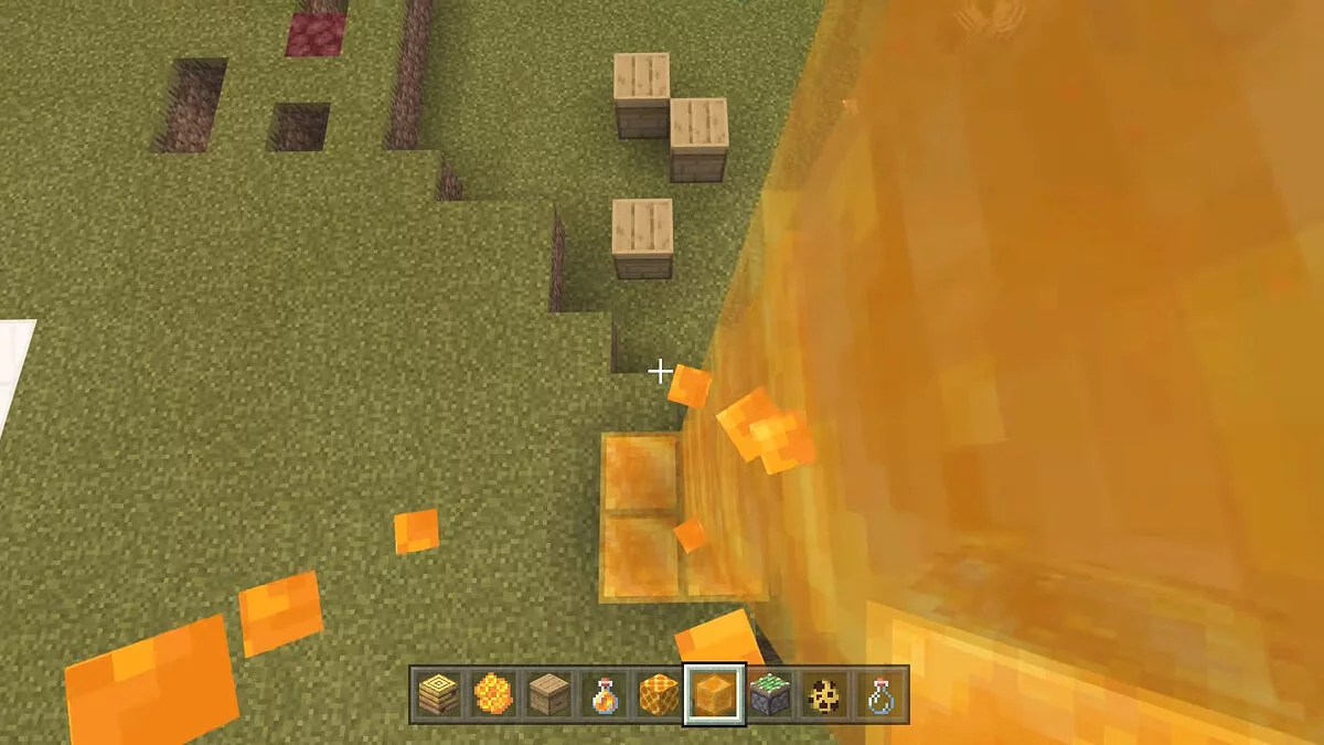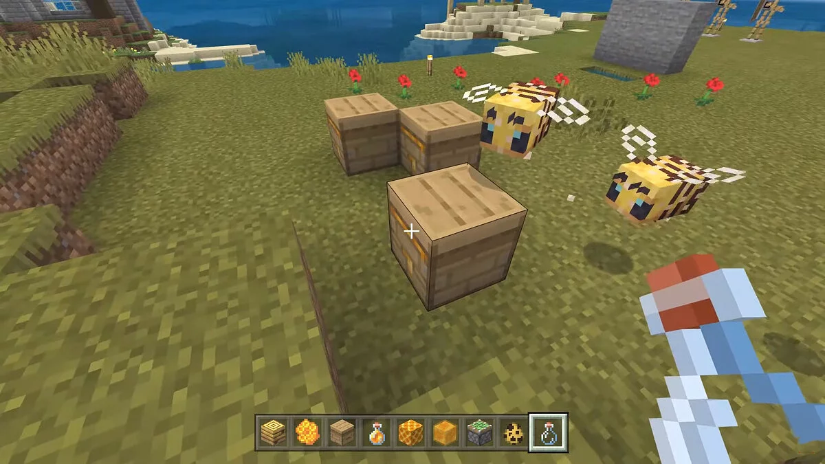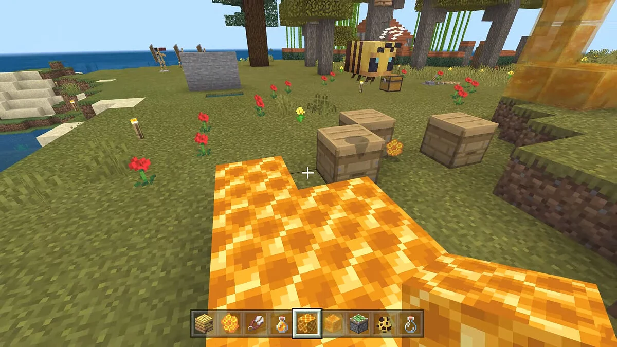 Кроме пчел, разработчики добавили новые блоки: медовый и из пчелиных сот. Блок из пчелиных сот не так интересен, так как в отличие от медового, он предназначен для декоративных целей. Блок меда по свойствам он напоминает слизь. Передвигаясь по таким блокам, персонаж замедляется, но зато они снижают урон от падения. По стене из медовых блоков можно медленно скользить. Соседние блоки к ним прилипают и если сдвинуть такую конструкцию, то сдвинутся уже оба блока. Кроме того, прыгать по медовой поверхности также затруднительно, и этим грех не воспользоваться в своих целях.