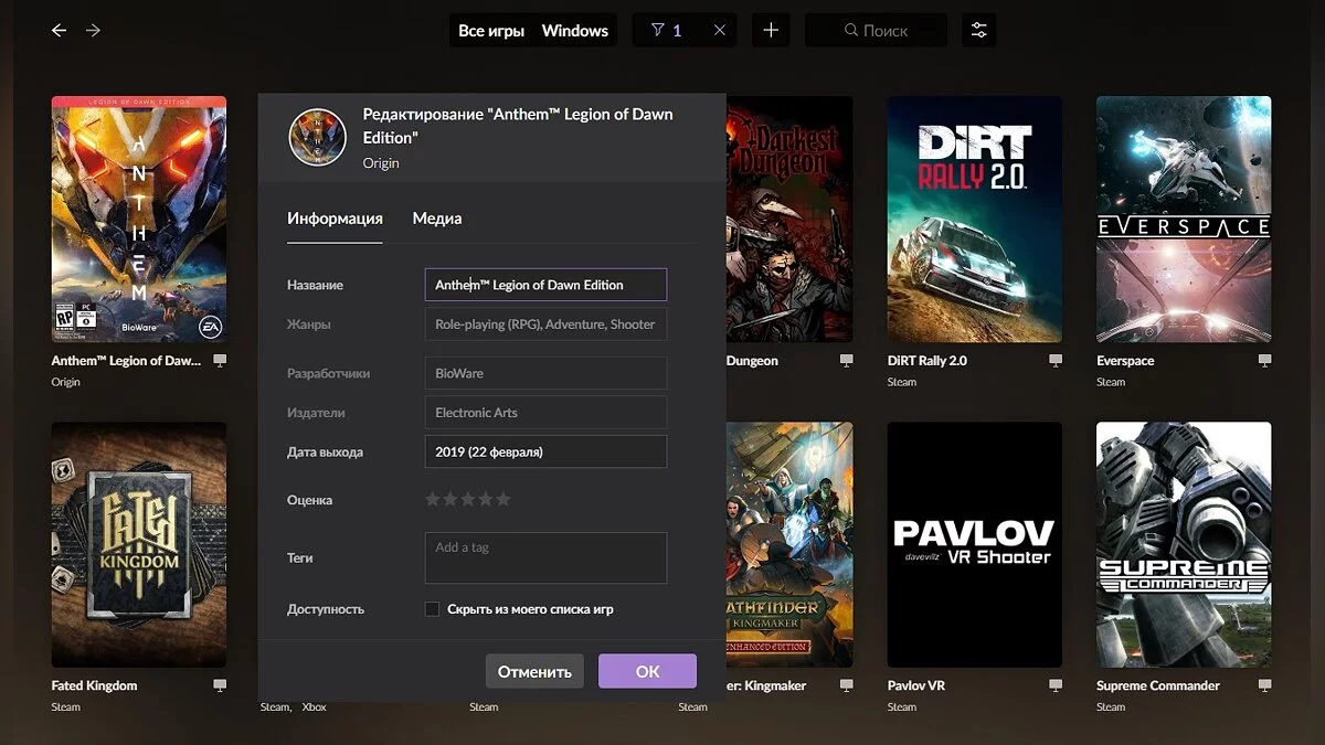Отдельные игры тоже можно редактировать, причем можно менять не только текстовую информацию, но и графику — обложку, фон и иконку. Еще можно добавлять теги и при необходимости скрывать любые игры. В этом плане Galaxy 2.0 просто находка для тех, кто любит все настраивать на свой вкус, однако большинство людей вряд ли будет использовать этот функционал. К счастью, при сканировании Galaxy 2.0 собирает большую часть информации самостоятельно.