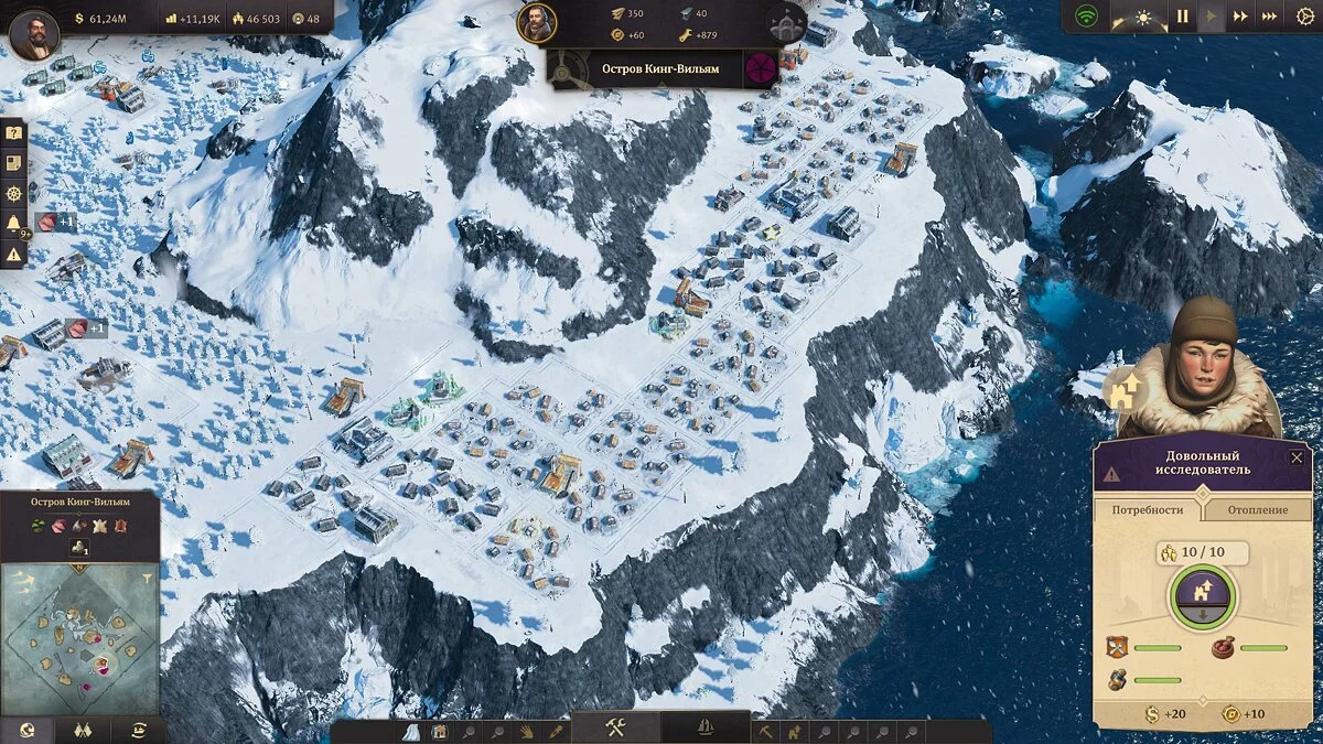 В геймплейном плане дополнение ощущается несколько вторичным. У жителей много потребностей, но одна половина закрывается поставками из Нового и Старого Света, а вторая половина так и останется в Арктике — всем этим теплым спальным мешкам и нардам нет места в других регионах. Единственный экспортируемый в Старый Свет ресурс — газ, замена нефти в электростанциях, причем сами жители Арктики почему-то не могут использовать его для обогрева.