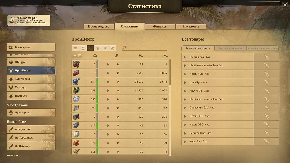 Другое важное новшество — полноценная статистика, показывающая дебет и кредит финансов, сырья, товаров, населения по островам и отдельным группам, включая даже диаграммы. Пользоваться ей удобно, когда у вас будет множество островов.