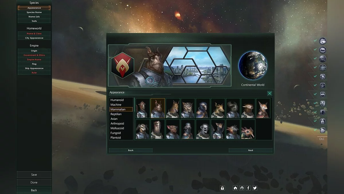 Каждая партия в Stellaris уникальна и не повторяется за счет продвинутого конструктора уровней. В главном меню игрок может выбрать из имеющихся или создать свою уникальную расу, задать форму правления, выбрать лидера, cгенерировать галактику по реалистичным лекалам и определить условия победы.