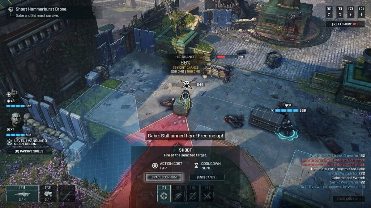 В битвах может быть только четыре отряда одновременно, но даже этого хватает для зрелищного сражения. Помимо классической стрельбы из укрытий, в Gears Tactics добавили обходы с флангов, атаки бензопилами в ближнем бою, броски связок гранат и уникальные способности, которые можно умело комбинировать ради дополнительных баффов и очков действия. Однако одна из лучших фишек игры — эффективно превращать поверженных врагов в бонусы. Убийство сбитого с ног врага даст очко действия каждому члену отряда, что, несомненно, станет отличным стимулом для более агрессивного сражения.