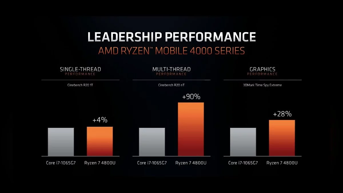 Еще один важный анонс от компании AMD касается третьего поколения мобильных процессор Ryzen. По словам представителей компании, на данный момент в линейку Ryzen 4000 входит восемь моделей. Все они выполнены по 7-нм техпроцессу на архитектуру Zen 2 и, если верить разработчикам, вдвое энергоэффективнее своих предшественников.