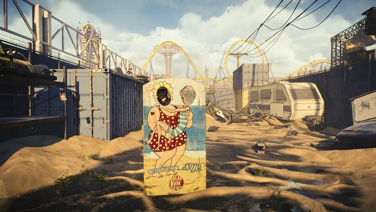 Эта часть Бруклина разительно отличается по настроению от промерзшего Манхэттена из первой части. И дело здесь не только в отсутствии снега. Никаких фото без вести пропавших, ровных рядов черных мешков для трупов или гор припасов, склеиваемых мародерами в одно место. Парк был оставлен на зиму ещё до эпидемии, и должен был по плану открыться весной, встретив туристов и жителей города. Однако «Чёрная пятница» внесла свои поправки в график работы. В итоге получился этакий развлекательный комплекс-призрак.