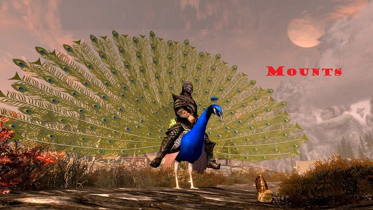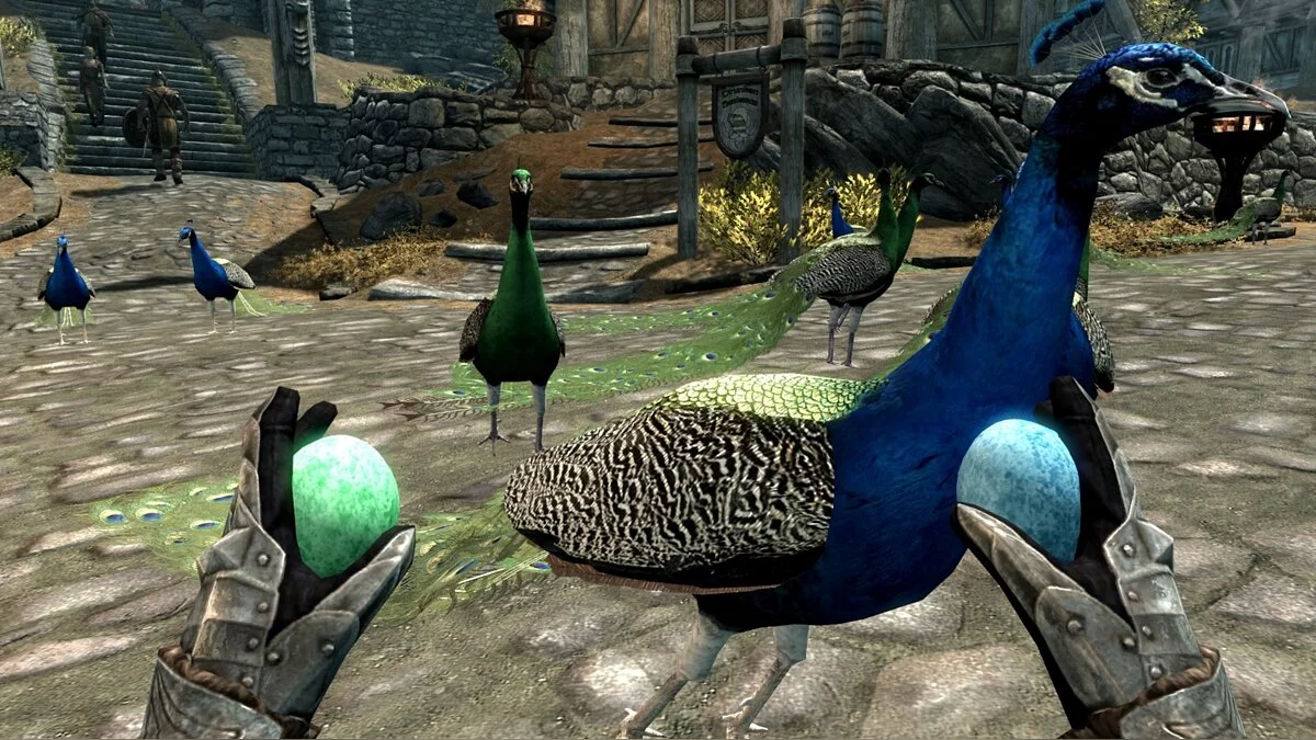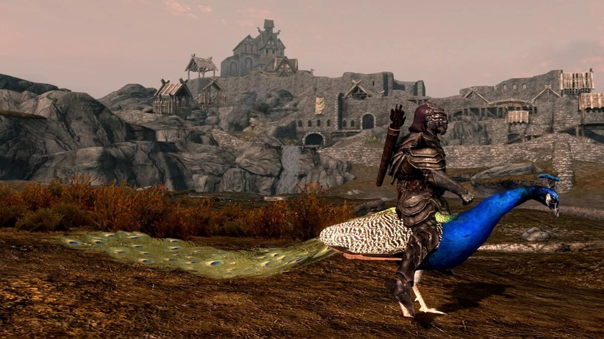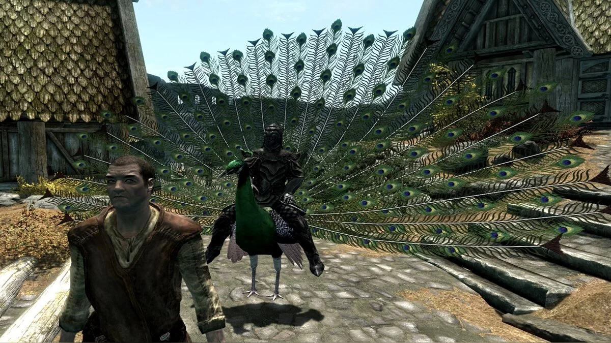 Кататься на лошадях, конечно, хорошо, но видели ли вы Довакина на павлине? И мы нет. И автор gg77 тоже нет. Но ему это не понравилось — решил исправить и добавил длиннохвостых птиц.