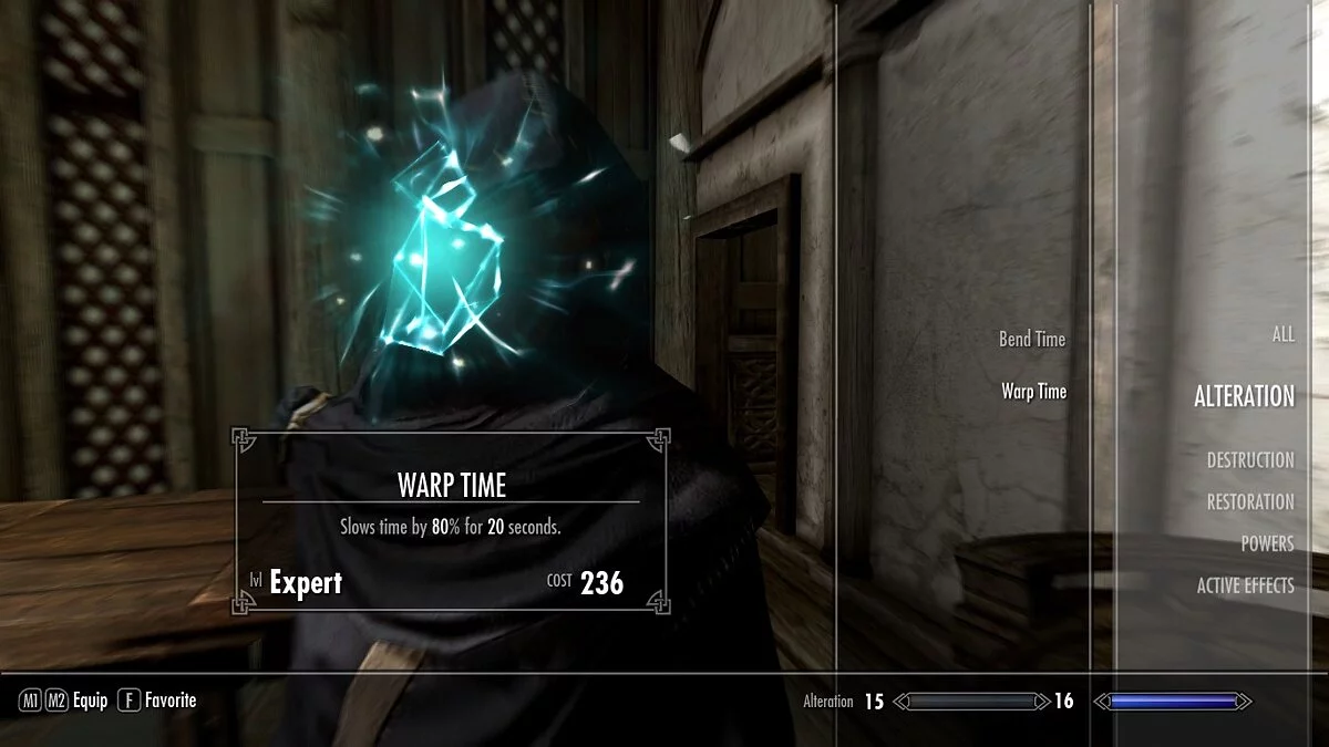 Другой замечательный мод под названием Timesplitter добавляет два заклинания для замедления времени: Bend Time низкого уровня и Warp Time экспертного уровня волшебства. Первое заставляет время идти медленнее на 40% в течение 10 реальных секунд, а второе — на 80% в течение 40 секунд.