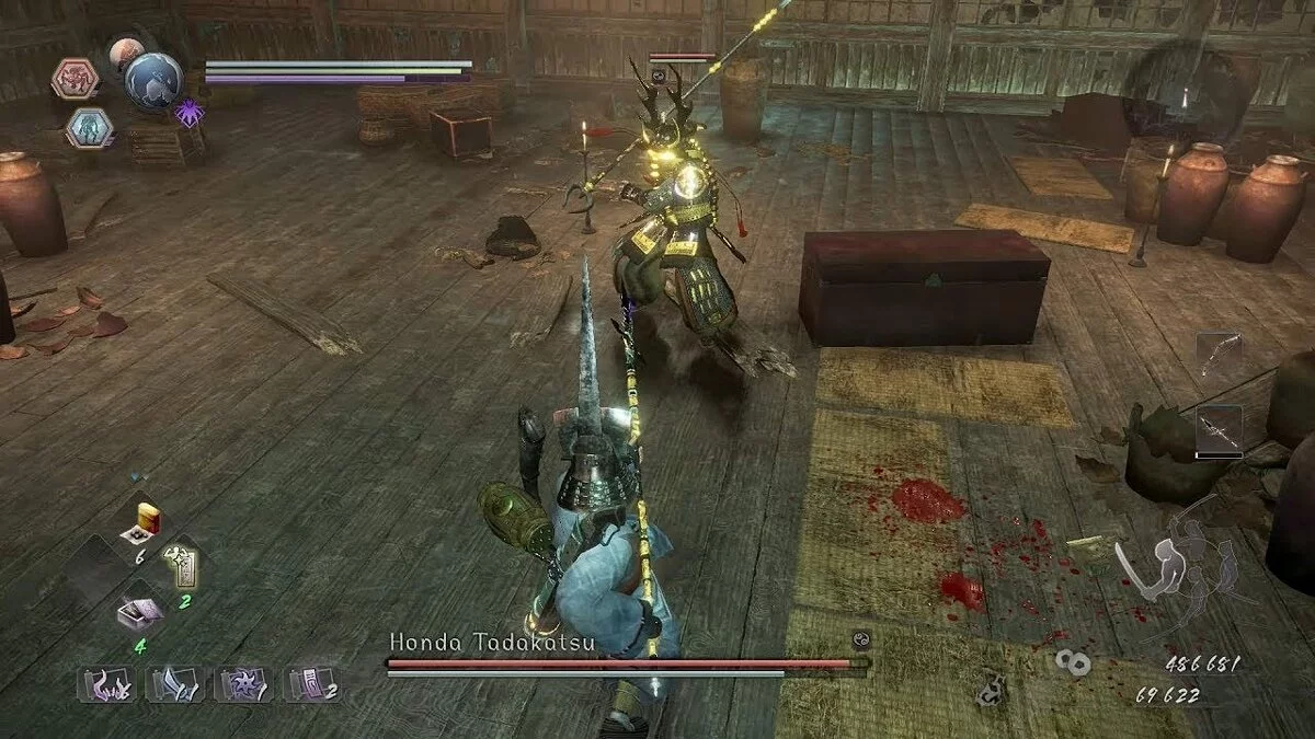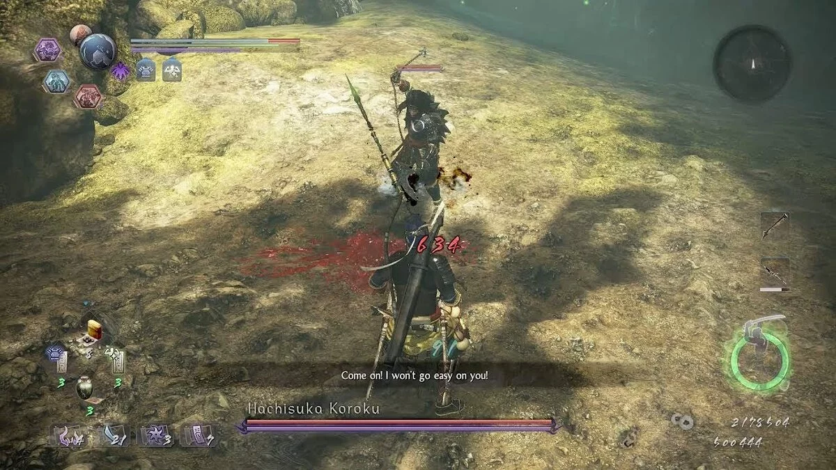 Не пытайтесь использовать против него длинные комбо. Бой будет длинный, но лучше придерживаться этой тактики и наносить по 1 удару (максимум 2). Если вы носите тяжелую броню, то у вас могут возникнуть проблемы со скоростью восстановления Ки, если есть возможность, то переоденьтесь в легкую. Перед боссом есть горячий источник. Он находится за скрытой стеной слева от босса, там стоят 3 противника-самурая. Можно использовать умение Талисман омоложения (Rejuvenation Talisman), которое непрерывно исцеляет героя.