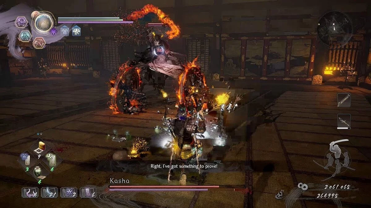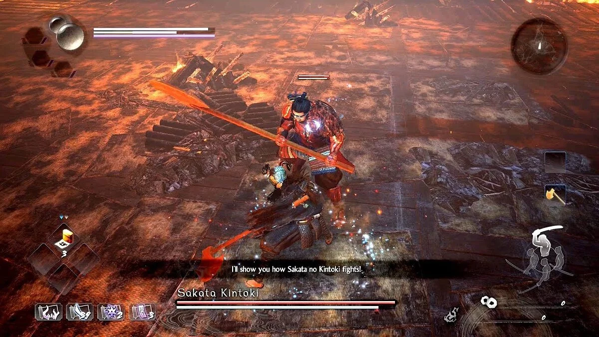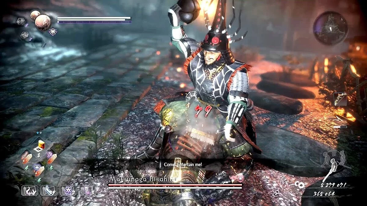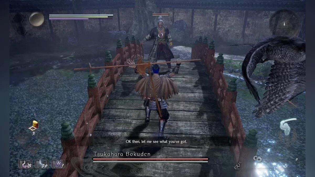 Отакэмару использует различные формы. Он будет регулярно переключаться между ними. Когда у него будет 50% здоровья, он перейдет в свою настоящую форму с совершенно другим набором движений. При 25% здоровья он снова меняет свой набор движений, вы увидите летающие рядом мечи, которые он будет бросать. Это самый сложный босс в игре, потому что у него много фаз и разных атак, которые часто могут убить вас за один удар.