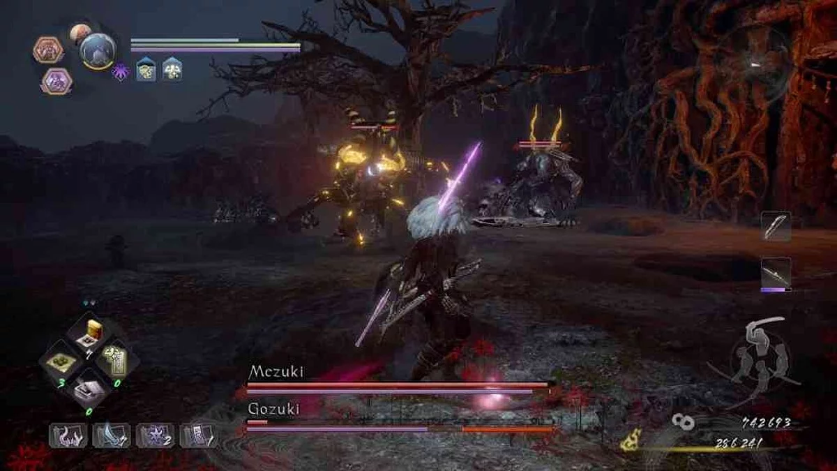 Еще одна причина, чтобы сначала сосредоточиться на Мэдзуки (синем), это то, что он использует летающие черепа и топор. Если вы сосредоточитесь на Годзуки, то сможете получить удар от дальних атак, который сложно заметить. Годзуки относительно безвреден, пока вы держите дистанцию.