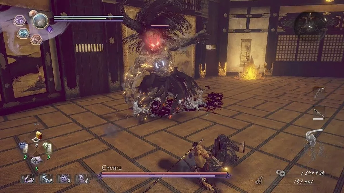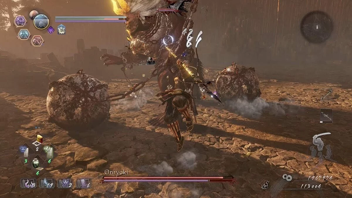 Онрёки (Onryoki) был вторым боссом в оригинальной игре Nioh. Если вы играли в нее, то вы должны быть хорошо знакомы с этим боссом. К счастью, на этот раз вы столкнетесь с ним намного позже в игре, прокачавшись и получив больше умений на выбор. На первом этапе он будет вращать вокруг два больших стальных шара. Они наносят огромный урон. Используем одиночные удары в высокой стойке когда он заканчивает вихрь, или когда он заканчивает ударом шарами перед собой. Всегда старайтесь атаковать его сзади, чтобы увеличить свой урон на 200%.