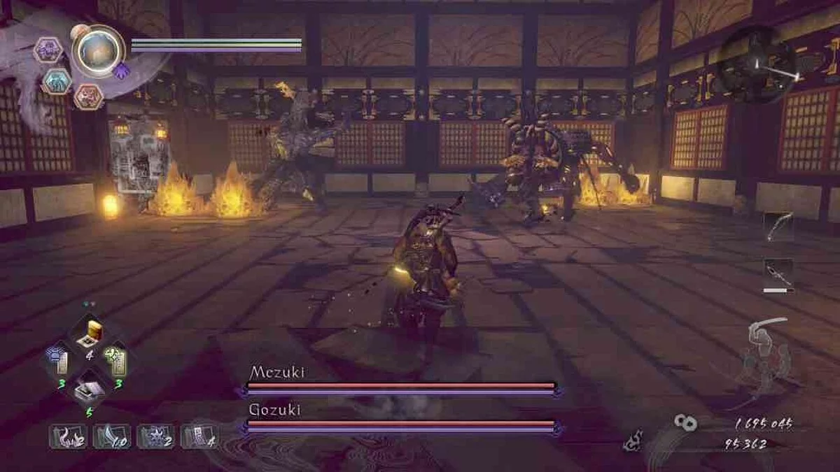 Этот бой начинается с других врагов: Гаки (Gaki) и Энки (Enki). Затем появляется Годзуки. Но когда у него снизится здоровье, появится и Мэдзуки, и вам приходится сражаться с ними двумя одновременно. Атакуем Годзуки, пока не добьем его. Можно использовать ловушки с оглушением. Пусть Годзуки войдет в них и будет оглушен. Заходим за его спину и выполняем свое сильнейшее комбо. Одного такого комбо должно быть достаточно, чтобы добить оставшиеся 10% его здоровья. Переключаемся на Мэдзуки.