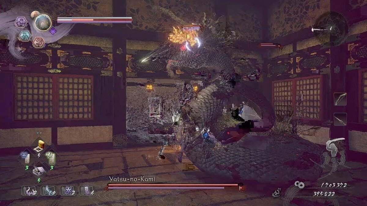 Яцуноками — медленный босс с предсказуемым набором ходов. Две основные атаки босса, которые вы можете использовать для своих ударов. Первая: когда босс замедляет свои две руки-змеи в земле, это оставляет его совершенно беззащитным для длинных комбо. Вторая: красная заряженная атака, при которой босс скользит вперед, бежим вбок и делаем комбо, когда он скользит мимо вас. Когда он двигается назад, повторяем то же самое.