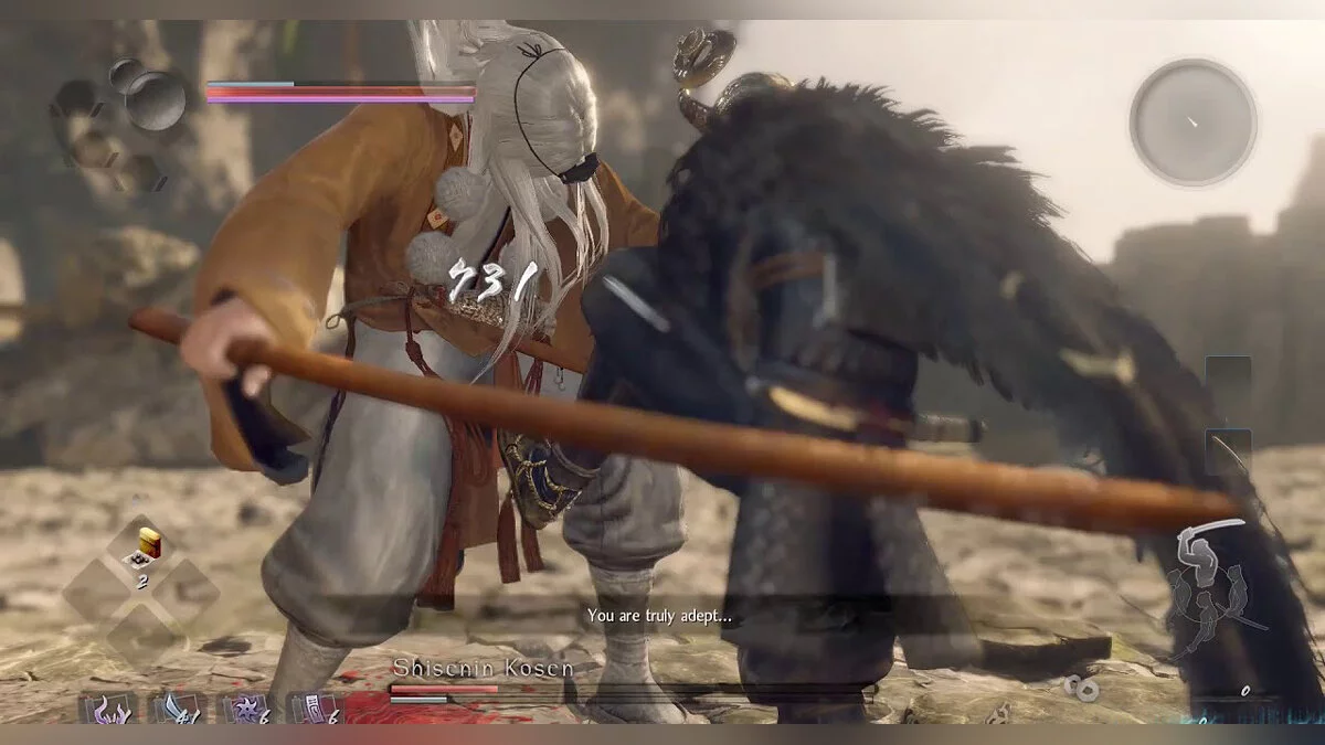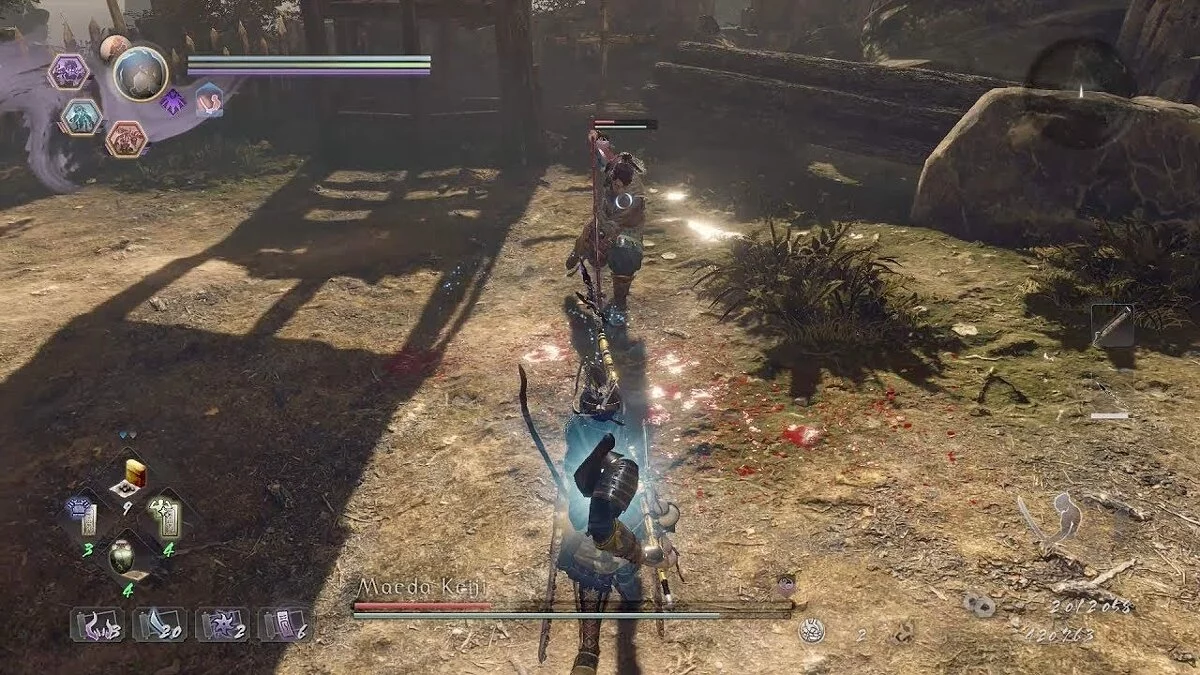 Саито Йошитатсу (Saito Yoshitatsu) — босс-человек, он может использовать все 3 типа духов-хранителей. Пока он в человеческом обличье, вам нужна только одна атака (квадрат) с копьем в высокой стойке. Затем используйте умение Размашистое копье (Spear Flourish), которое можно купить в списке умений для копья (Spear Skill), просто нажимайте (R1) чтобы сделать Ki-Burst). Повторяйте эти два движения. Это будет постоянно ошеломлять его и отталкивать в угол. Единственное, что он сможет сделать — это захват. Когда вы увидите, как его рука создает белый туман, уклонитесь, а затем повторите привычную комбинацию.