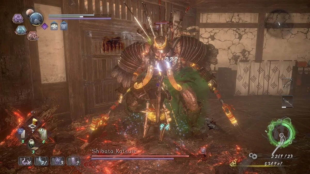 Используем копье в высокой стойке и привычные умения с оглушением и толчком. Постарайтесь затолкать противника в угол. Там босс не сможет двигаться или атаковать. Когда у вас не будет Ки, ваши атаки замедлятся, и босс сможет вырваться. Но его можно попытаться толкнуть в дверь, где вы появляетесь, тогда у него будут проблемы с уходом, что сделает битву еще проще.