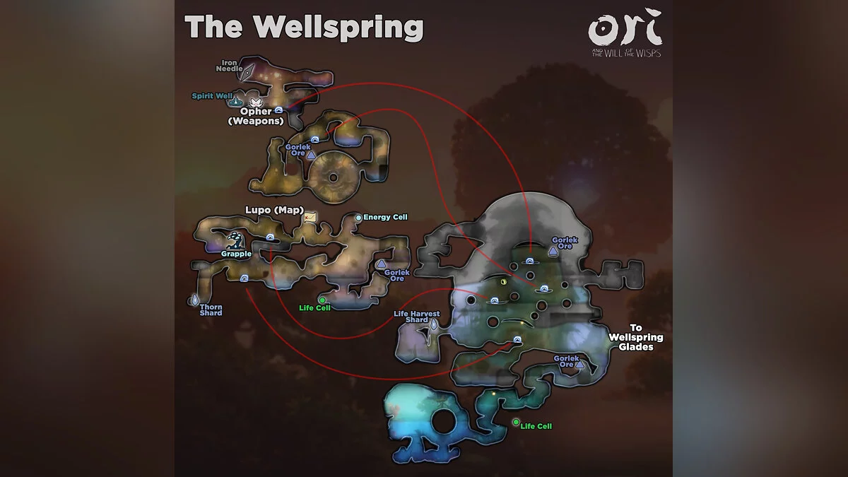 - Карта локации «Родник» в Ori and the Will of the Wisps с расположением важных предметов