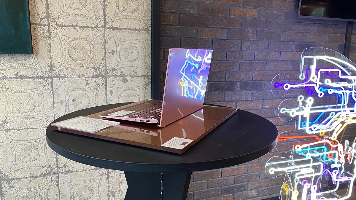 Демонстрация ноутбуков проходила в формате экспозиции. Приглашенные гости могли неторопливо ходить вокруг столов, c расположившимися на них устройствами. Как экспонаты, они сопровождались небольшими пояснительными табличками без особой конкретики и иногда семплами материалов, используемых при изготовлении их корпусов. Да. Происходящее больше походило на высокотехнологичный музей, в котором можно было трогать вещи руками, не боясь оказаться в ближайшем участке за хулиганство.