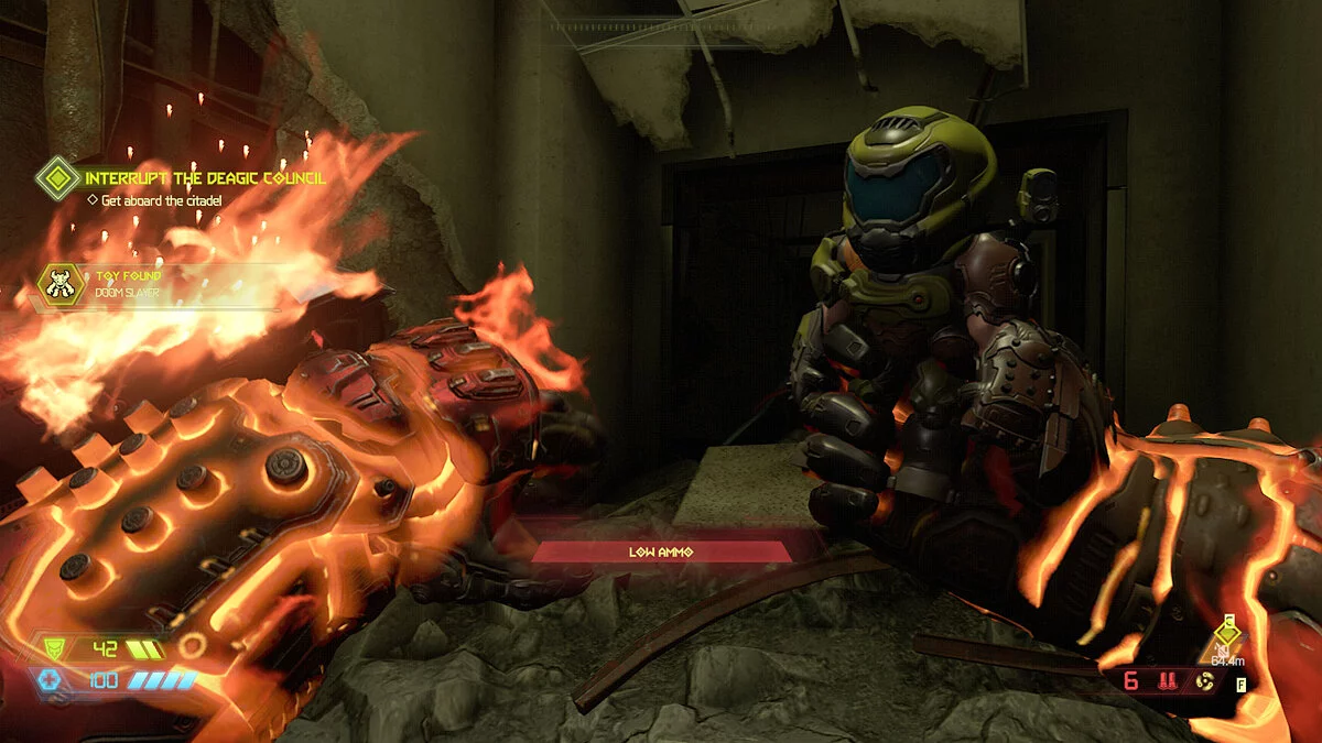 Когда вы перейдете в городскую часть первой миссии, вы попадете в разрушенный жилой комплекс. Чтобы продвинуться дальше, вы должны пробить разрушаемую стену. Вместо того, чтобы идти прямо на уровень, который находится после разрушения стены, посмотрите вверх и налево. Двойной прыжок туда, где зомби, и в коридоре справа от него можно найти игрушку.