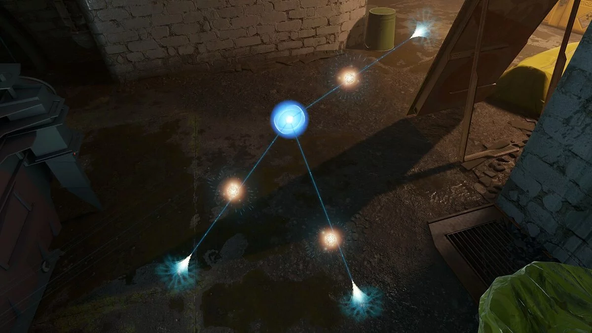 Начнем с последних, потому что они самые простые. Это легкие пространственные задачки, которые очень быстро решаются в VR. Задача игрока в том, чтобы с помощью мультиинструмента переместить ключевой узел на правильную позицию. Лучи, исходящие из узла, должны пересечь все точки без исключения. К слову, узлов может быть несколько, и лучи одного узла не должны пересекать узлы другого. Но такие головоломки будут только ближе к концу прохождения.