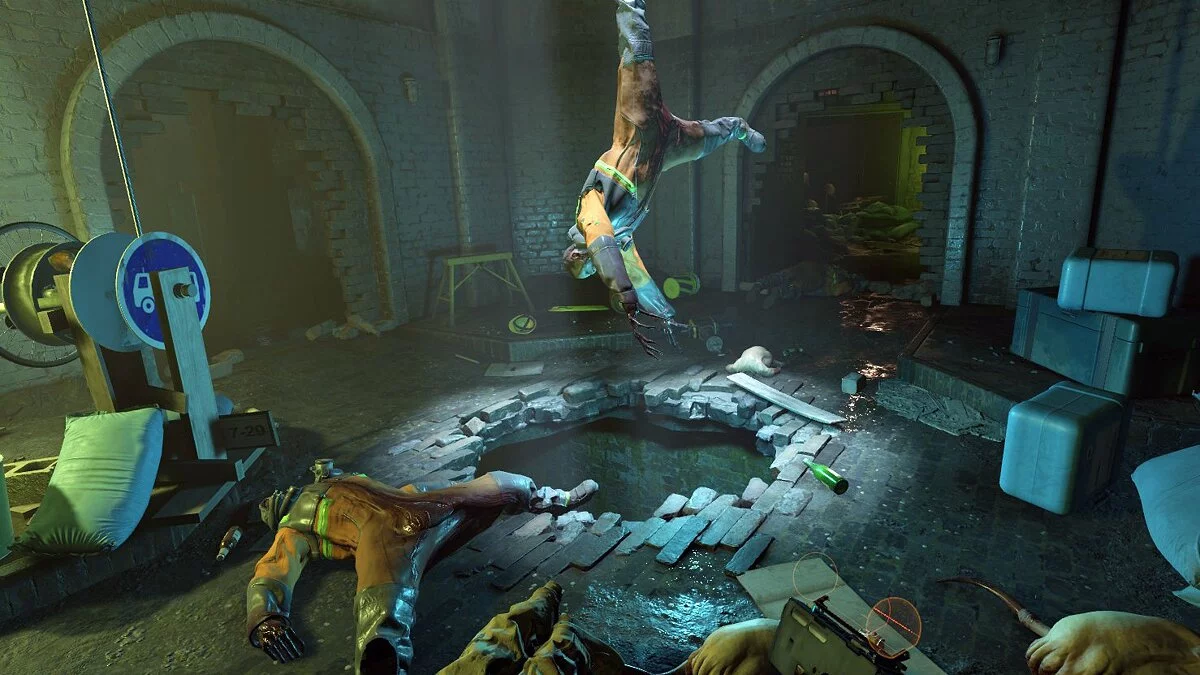 Сразу после этого механизм придет в действие, и труп опустится вниз, в яму с кольями. Достать дробовик оттуда не получится, поэтому придется вновь воспользоваться куском трубы, который мы вытащили. Берем ее в правую руку, а левой начинаем крутить велосипедную педаль.