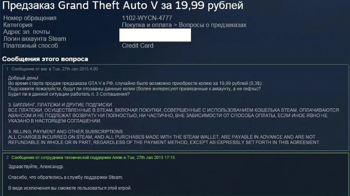 У игроков, успевших оформить предзаказ за бесценок, начали изымать GTA из библиотек и возвращать те самые 20 рублей. Игровое сообщество начало указывать на пользовательское соглашение, в котором был прописан пункт о том, что все платежи, осуществленные в Steam, включая покупки, совершенные с использованием кошелька, оплачиваются авансом и не подлежат возврату ни полностью, ни частично, вне зависимости от способа оплаты. Несмотря на это, Valve не вернула большинству игроков их копию, но некоторые все-таки смогли договориться со службой поддержки. Им «в порядке исключения» оставили экшен от Rockstar.
