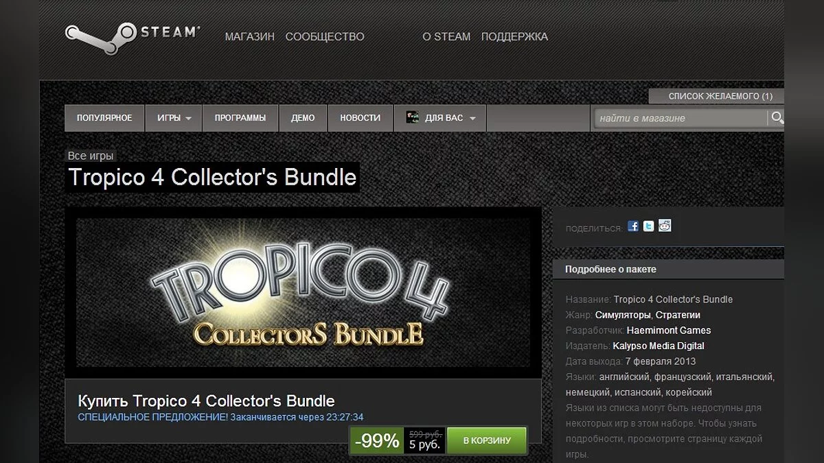 В течение часа игроки могли со скидкой в 99% за 5 рублей приобрести экономическую стратегию. Стоит отметить, что помимо самой игры, расторопные пользователи получили за символическую плату и все дополнения для нее.