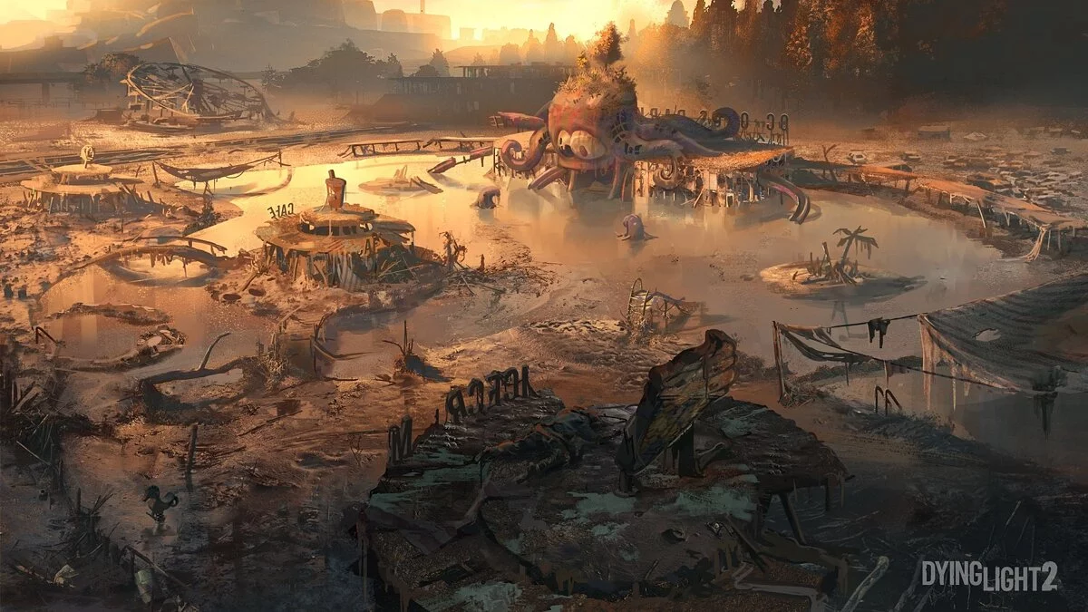 В Dying Light 2 нас ждут не только различные виды зомби, но и разнообразные места их обитания. Недавно разработчики опубликовали концепт-арт заброшенного парка развлечений, который судя по виду будет небольшой столицей для не самых приятных существ. А самое интересное, что парк может стать таким из-за действий игрока. Techland так описывает этот концепт: