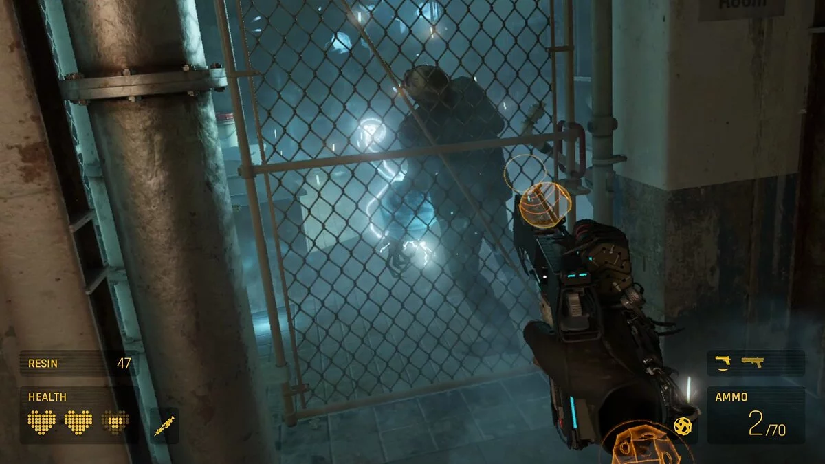Как только приноровитесь избегать атак «собаки», можно понемногу начать обстреливать ее из любого оружия. Но делать это тоже нужно с умом: нашпиговать реанимированное тело свинцом не получится. Чтобы победить, нужно целиться в ту часть тела, где сейчас находится пришелец. Ее можно распознать по набухшему комку белого цвета. Он не такой уж и большой, поэтому придется хорошенько прицелиться, что довольно трудно, учитывая постоянную необходимость избегать ударов тока.