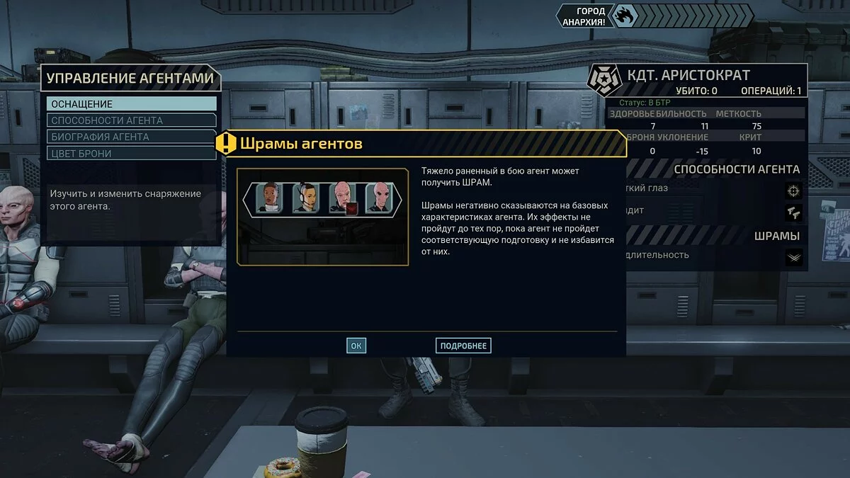 Кроме того, многие активности требуют свободного агента. Это заставляет менять персонажей. И вот здесь тоже есть проблемы. Дело в том, что даже один выдернутый боец может сломать всю вашу стратегию. А выдергивать его рано или поздно придется. Особо полезные задания вроде снижения уровня анархии в городе, может выполнять только уже прокаченный оперативник. То есть придется отправлять кого-то из вашей основной команды, заменяя его новобранцем. А это тянет за собой переоснащение отряда под новые условия.