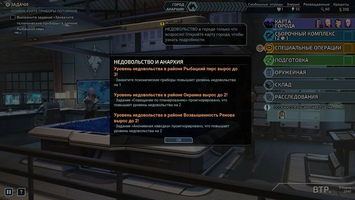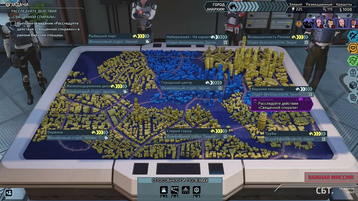 Глубокого геймплея здесь не ждите — достаточно лишь следить, чтобы все были при деле, а уровень анархии в городе не зашкаливал. Когда он перевалит за определенную планку, игра закончится. Это вынуждает игрока как-то реагировать на побочные миссии и покупать полевые отряды, которые не только приносят ресурсы, но и могу помочь снизить уровень анархии. Можно даже посадить целый район на карантин. Но здесь, к сожалению, игра проседает. Побочные задания, которые представляют под собой прохождение еще одной тактической локации не предлагают ничего нового.