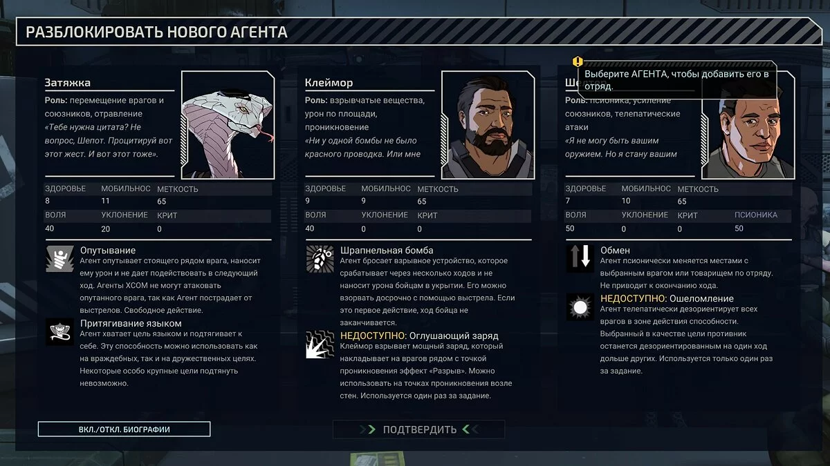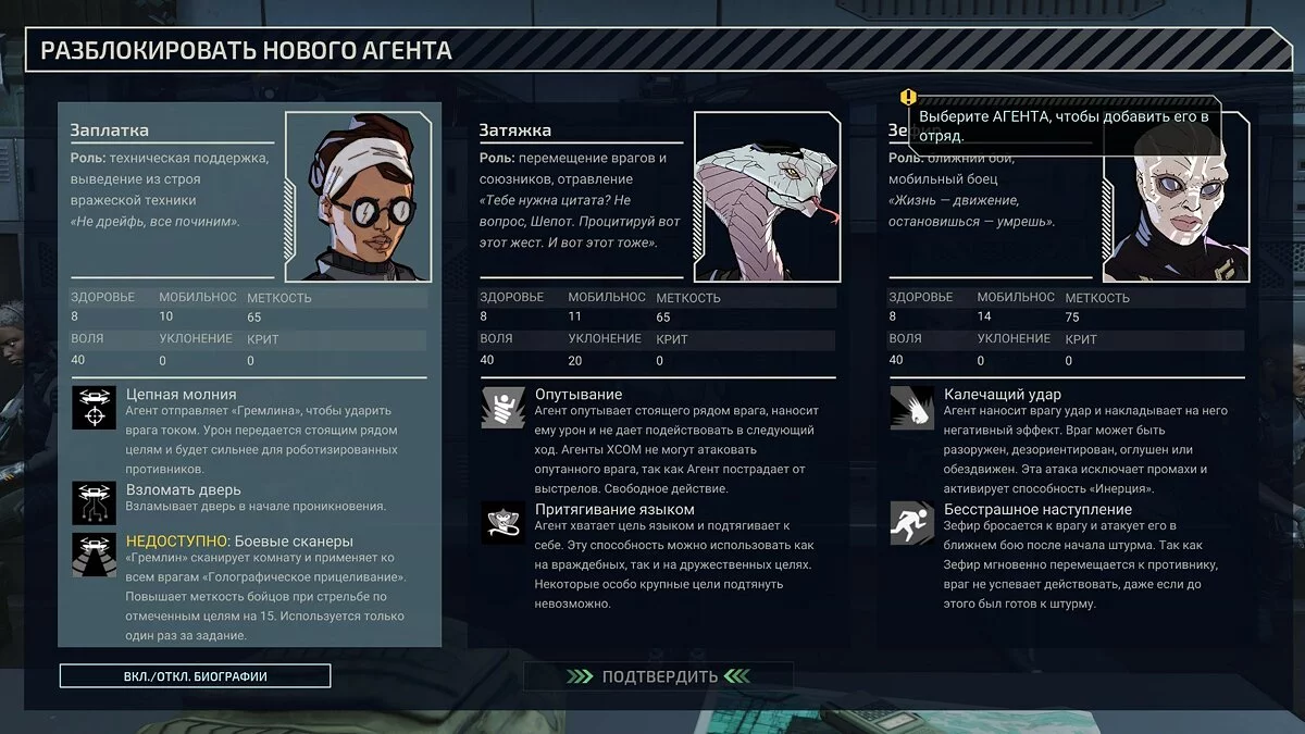 И если стиль рисовки и цветовую гамму еще можно списать на вкусовщину, то дизайн и проработка персонажей вызывает вопросы. Каждый агент в Chimera Squad — личность. Со своим позывным, характером и мотивами. Но выражается это все в основном через профайл, в котором можно почитать предысторию, а также короткие диалоги. Во время боя, конечно, никакой словесной активности кроме повторяющихся возгласов нет, но между миссиями многие не прочь перекинуться парой слов с сослуживцами. Иногда это даже забавно.