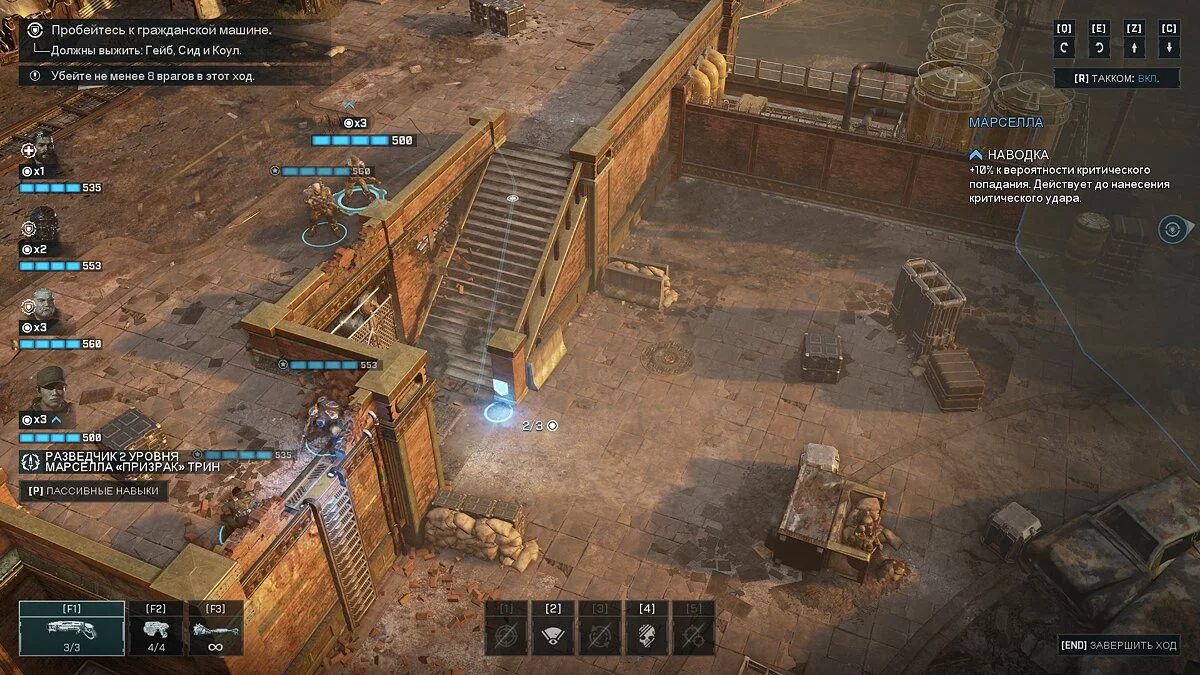 Даже снайперы не теряют темп вашей атаки — после смены позиции они могут стрелять сразу же, а не на следующий ход! В копилку отличий Gears Tactics от XCOM надо добавить отсутствие у бойцов психологического состояния и переноса ранений, травм, из боя в бой. Даже если жизнь ваших солдат под конец битвы с боссом держались на волоске, их лупили и бросали по всей арене, на следующий бой они выйдут в полном здравии.