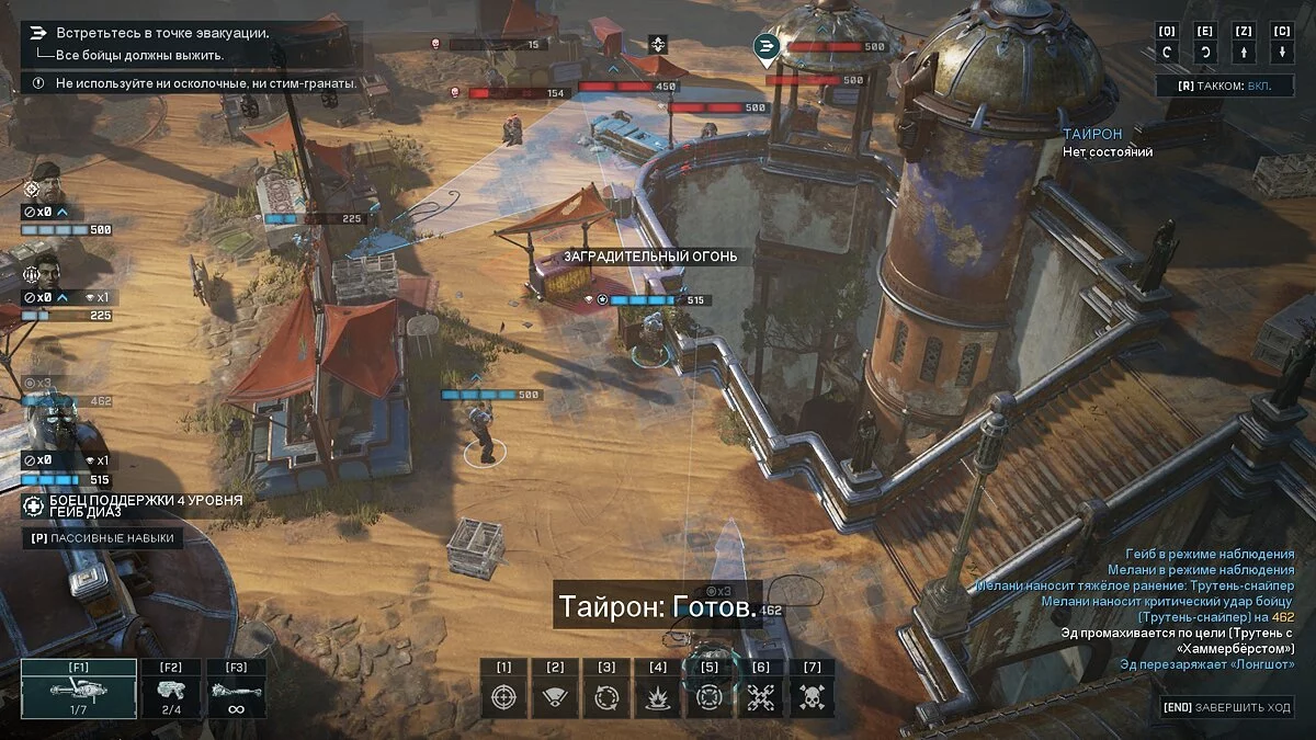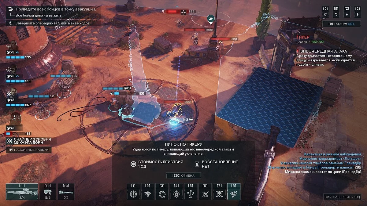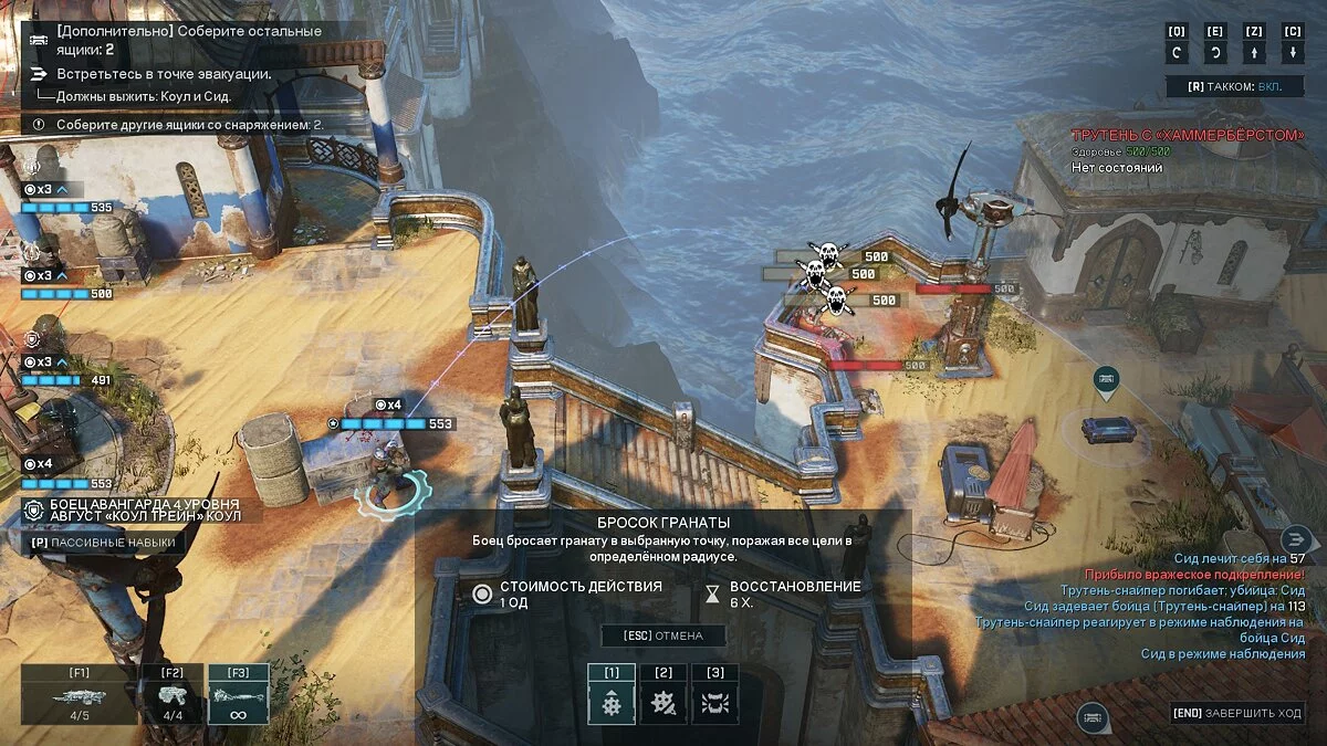 Если же стрельбой сбить врагу полосу здоровья, то с некоторым шансом он упадет в нокдаун и будет истекать кровью. Для нас же важна функция казни — любой боец может добить упавшего на колени врага, а все остальные персонажи получат дополнительное очко действия. И если клинок или бензопила — это способности с откатом, то вот казнить можно без оглядки.