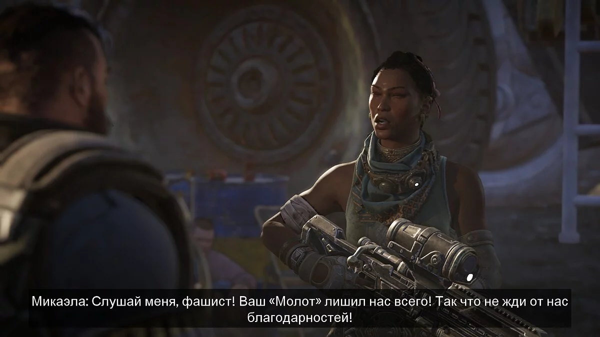 Главный герой вроде как разочаровался в председателе Прескотте и сопротивлении, но смерть пары товарищей по несчастью достаточно мотивирует, чтобы на фоне апокалипсиса гоняться за непонятным рогатым чертом. Или наша союзница Микаэла. Вот она при встрече обзывает «Шестеренок» фашистами, бомбящими собственное население. Но стоит только произнести «Укон», как меняет гнев на милость и обещает помочь с его уничтожением.